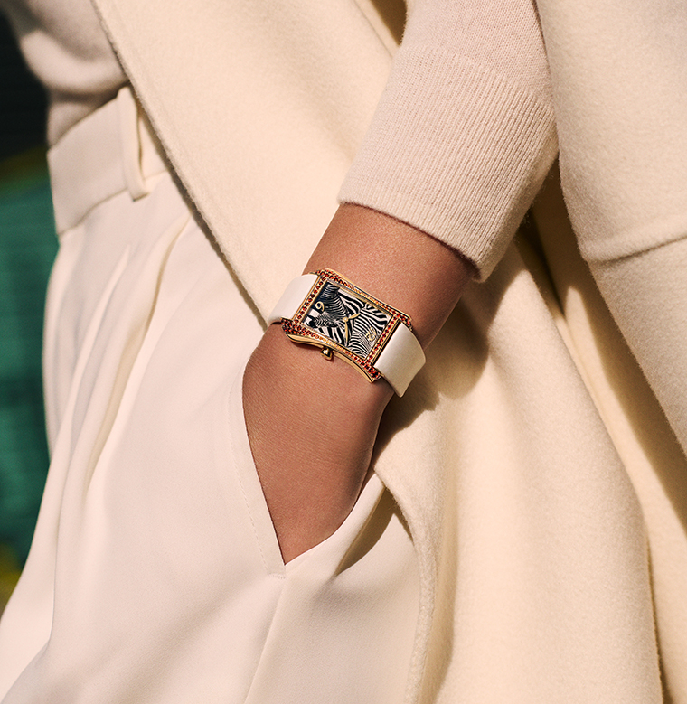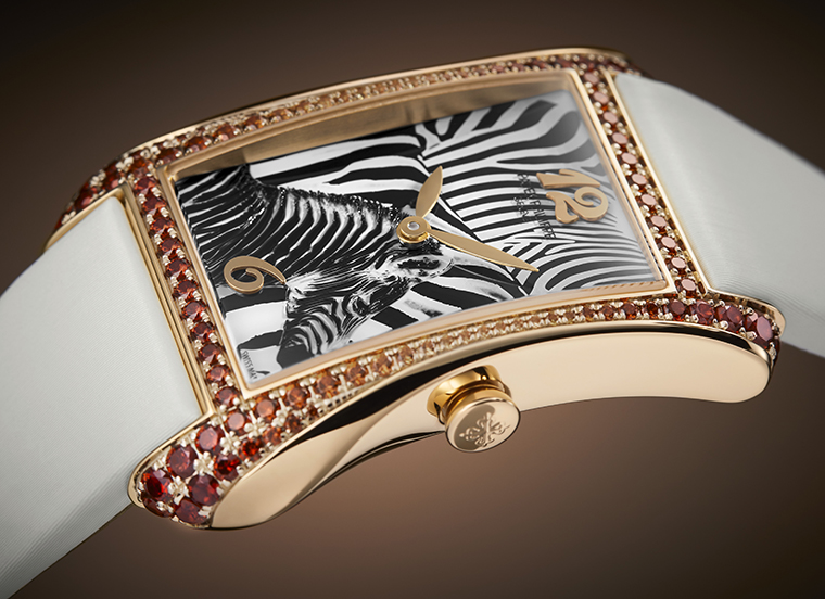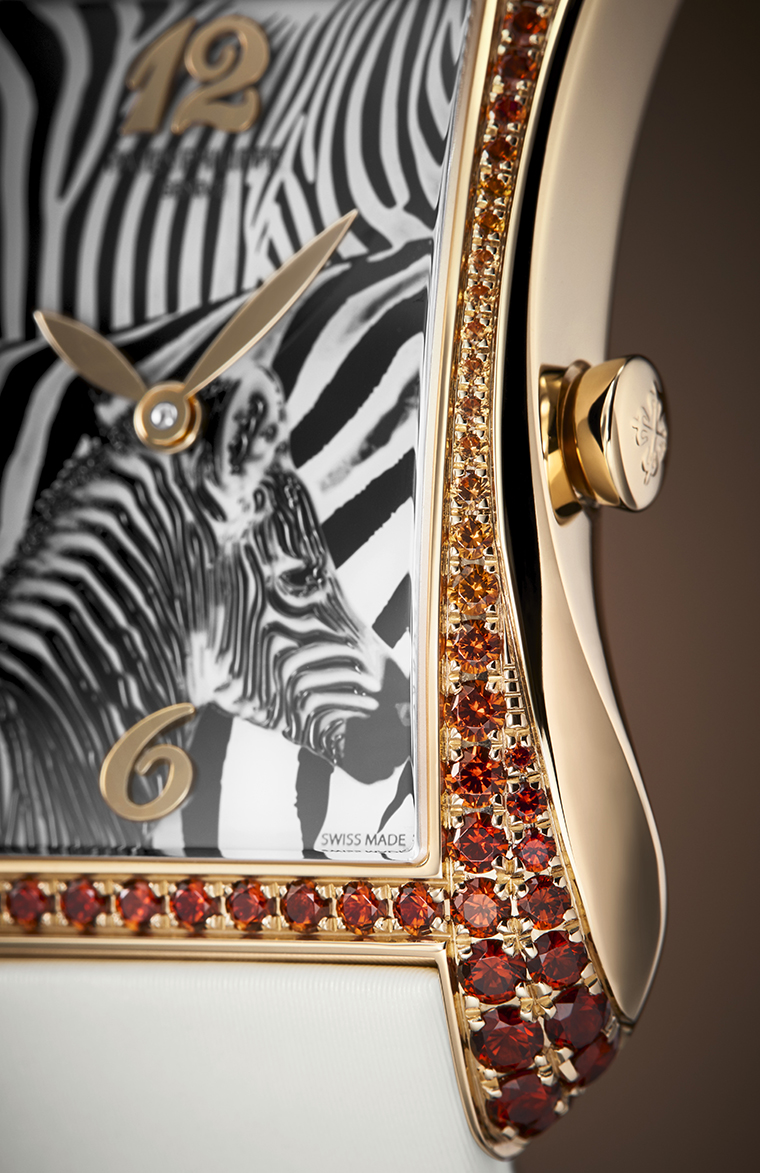 ภายในตัวเรือนพิงก์โกลด์ขนาด 28.6 x 40.85 มม. ขอบตัวเรือนประดับด้วยอัญมณี spessartite จำนวน 94 เม็ด น้ำหนักรวม 2.02 กะรัต ไล่เฉดสีจากโทนคอนญักเข้มบริเวณตำแหน่ง 12 และ 6 นาฬิกา ไปจนถึงสีส้มสว่างที่ 9 และ 3 นาฬิกา เกิดเป็นจังหวะของ “แสงและเงา” ที่เน้นรูปทรงเว้าโค้งอันอ่อนช้อยของตัวเรือนให้ดูราวกับสายน้ำที่ไหลรินไปตามข้อมือ แถวอัญมณีชั้นที่สองบริเวณด้านล่างของตัวเรือนช่วยขับเน้นเส้นโค้งอสมมาตร ให้เรือนเวลาเปล่งประกายอย่างมีชีวิตในทุกองศา หน้าปัดเผยตัวเลขโรมันที่ตำแหน่ง 12 และ 6 นาฬิกา เข้าคู่กับเข็มทรงใบไม้สีพิงก์โกลด์ที่เคลื่อนไหวอย่างสงบเสงี่ยมบนพื้นลายม้าลายอันเปี่ยมพลัง