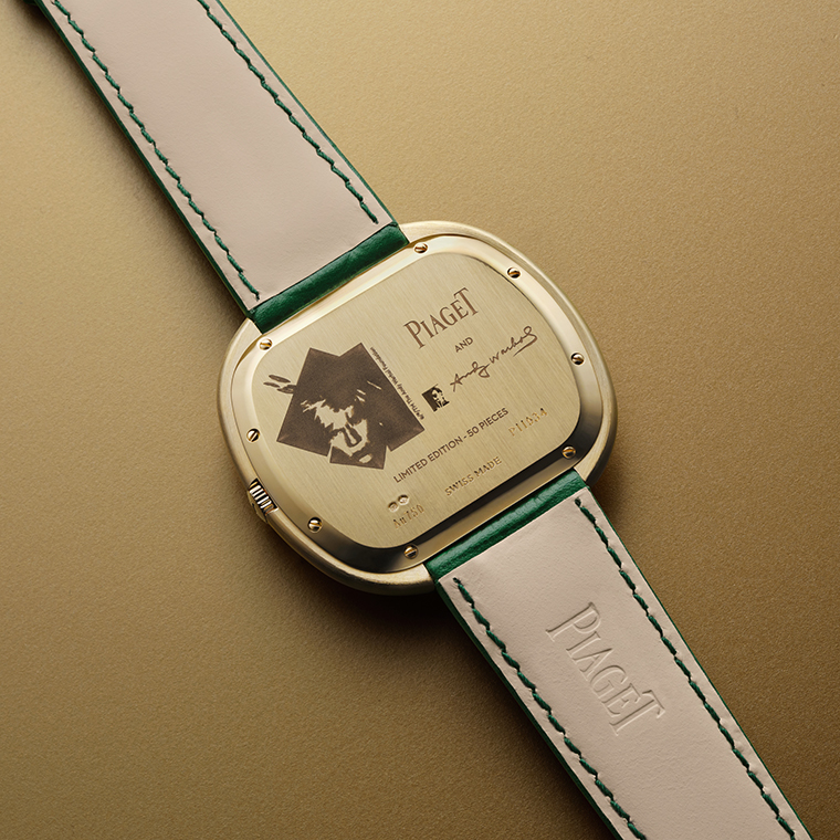 หน้าปัดล้อมกรอบด้วยตัวเรือนเยลโลว์โกลด์ 18 กะรัต ขนาด 45 มม. ขอบตัวเรือนดีไซน์แบบขั้นบันได และจับคู่กับสายหนังสีเขียวเข้มที่ให้ความรู้สึกหรูหราแต่ไม่แย่งความสนใจไปจากหน้าปัดได้ เมื่อพลิกมาที่ด้านหลังตัวเรือนจะพบกับการตกแต่งด้วยการขัดลายซาตินแนวตั้ง ซึ่งปกป้องกลไกที่อยู่ภายใน อย่าง กลไกอัตโนมัติ Calibre 501P1 ที่ผลิตขึ้นภายในโรงงานของ Piaget เอง มอบสำรองลานยาวนาน 40 ชั่วโมง พร้อมการตกแต่งลาย Côtes de Genève อันประณีต เหนือสิ่งอื่นใด ที่ฝาหลังยังปรากฏภาพสลักใบหน้าของ Andy Warhol จากภาพถ่ายพอร์เทรตของกล้องโพลารอยด์อันเป็นต้นแบบแห่งแรงบันดาลใจในการสร้างสรรค์นาฬิกาเรือนนี้ พร้อมด้วยโลโก้ Piaget และลายเซ็นของศิลปินผู้ยิ่งใหญ่ และนี่คืออีกชิ้นงานที่รังสรรค์ขึ้นเพื่อตอบโจทย์ผู้ที่แสวงหาเรือนเวลาอันทรงคุณค่าและควรค่าแก่การสะสม