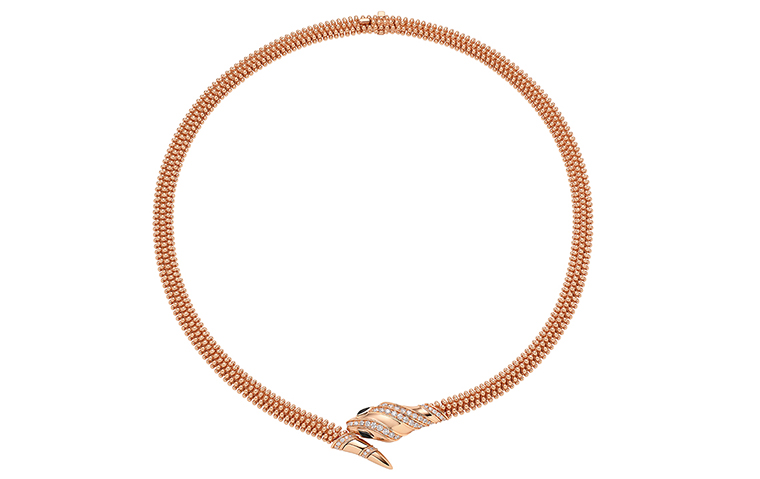 เติมเต็มความสมบูรณ์แบบให้กับการเปิดตัวครั้งนี้ด้วยสร้อยคอรุ่นพิเศษ ซึ่งเป็นการตีความอันทรงเสน่ห์สะกดใจในทองคำโรสโกลด์ ที่ประดับตกแต่งด้วยทับทิมและเพชรทั้งบนหัวและหางของงู รังสรรค์เป็นมิติอันล้ำค่าและดึงดูดใจ ทั้งยังเสริมด้วยความเย้ายวนสะกดสายตาด้วยดวงตาทับทิม ที่ถ่ายทอดความน่าหลงใหลให้กับสัตว์แห่งตำนานนี้ได้อย่างไร้ที่ติ พร้อมเปล่งประกายด้วยรัศมีแห่งการแสดงออกอันสดใสและเต็มไปด้วยชีวิตชีวาของพลังแห่งการเปลี่ยนแปลง