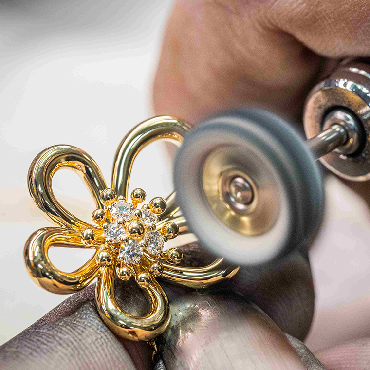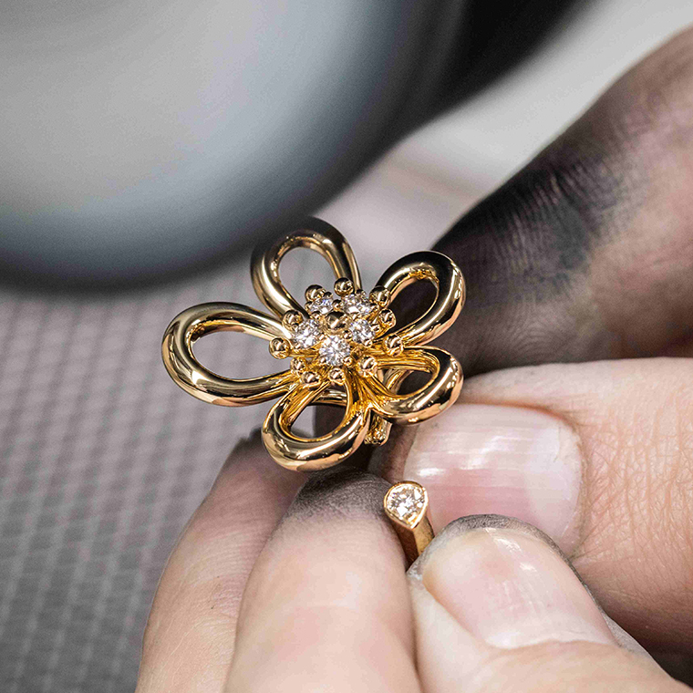 อีกหนึ่งผลงานที่ถ่ายทอดความประณีตอันงดงามอันเป็นเอกลักษณ์ของเมซง Flowerlace โดดเด่นด้วยเส้นสายทองคำอันอ่อนช้อยและกลีบดอกไม้ที่บานสะพรั่งอย่างอสมมาตรอย่างมีจังหวะ ทุกรายละเอียดตั้งแต่เขี้ยวหนามเตย ลูกปัดทอง ไปจนถึงเกสรเพชรเจียระไน ล้วนผ่านการขัดเกลาอย่างพิถีพิถัน เพื่อสะท้อนประกายแสงระยิบระยับราวแสงแดดต้องผิวน้ำ เพชรทุกเม็ดได้รับการคัดสรรอย่างเข้มงวดตามมาตรฐานสูงสุด ทั้งในด้านสี (D–F) และความใสบริสุทธิ์ (IF–VVS) ถ่ายทอดความงามแห่งธรรมชาติด้วยทักษะงานหัตถศิลป์และความละเมียดละไมอันเป็นเอกลักษณ์ของเมซงะเมียดละไมอันเป็นเอกลักษณ์ของเมซง