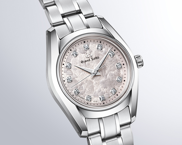 สำหรับผลงานรุ่น STGF387G เป็นนาฬิกาสำหรับสุภาพสตรีที่มาพร้อมกลไกควอตซ์ ขนาดตัวเรือนเพียง 26 มม. เป็นหนึ่งในสมาชิกรุ่นใหม่ล่าสุดเข้ามาเติมเต็มตระกูล 62GS มอบตัวเลือกที่สง่างามและขนาดกำลังดีสำหรับผู้ที่ชื่นชอบความสง่างามแบบเรียบง่าย สำหรับนาฬิกา 62GS ดั้งเดิม นั้นเคยเปิดตัวเป็นครั้งแรกไปในปี 1967 พร้อมกับกลไกอัตโนมัติเรือนแรกของ Grand Seiko และได้กลายเป็นหนึ่งในดีไซน์ที่ทรงคุณค่าที่สุดตลอดกาล สำหรับผลงานรุ่นนี้ นำความคลาสสิกมาผ่านการตีความใหม่ผ่านหน้าปัดที่สะท้อนเสน่ห์ของฤดูกาลในประเทศญี่ปุ่น โดยได้รับแรงบันดาลใจจากภาพ “ฮานะอิคาดะ” (Hana-Ikada) หรือ “แพดอกไม้” อันงดงาม ซึ่งเกิดขึ้นเมื่อกลีบดอกซากุระถูกสายลมในฤดูใบไม้ผลิพัดปลิวร่วงหล่นและกลีบบอบบางจับตัวกันเป็นแพบนผิวน้ำ ด้วยดีไซน์ไร้ขอบตัวเรือน (bezel-free) ที่สืบทอดจาก 62GS รุ่นต้นแบบ ช่วยให้หน้าปัดดูมีมิติและกว้างยิ่งขึ้น ขณะที่งานขัดเงาเทคนิคซารัตสึ (Zaratsu) ถ่ายทอดเหลี่ยมมุมอันคมชัดและงดงามรอบตัวเรือน แม้จะมีขนาดเล็กกะทัดรัดเพียง 26 มม. แต่ก็ยังคงไว้ซึ่งความชัดเจนและอ่านค่าเวลาได้ง่ายดาย ในส่วนของเพชรน้ำงามที่ถูกจัดวางอย่างสมมาตรบนหน้าปัดช่วยเพิ่มประกายระยิบระยับและความหรูหรา ขณะที่กลไกภายในบรรจุเครื่องควอตซ์ คาลิเบอร์ 4J51 ซึ่งมอบความเที่ยงตรงสูงถึง ±10 วินาทีต่อปี
