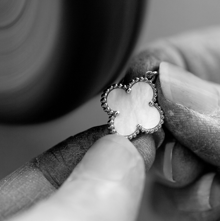 ท่ามกลางงานเดินขอบด้วยลูกปัดทองกลมกลึง เนื้อผิวเกลี้ยงเกลาเป็นเงางาม ให้ความรู้สึกละมุนละไมคือเขี้ยวหนามเคยปลายลูกปัดสำหรับใช้ดัดงอลงมายึดแผ่นโมทิฟให้ประกบแนบแน่นกับตัวเรือน ภายใต้ความประณีต พิถีพิถันทางงานฝีมือของสุดยอดช่างศิลป์เครื่องประดับ งานขัดผิวขั้นตอนสุดท้ายจะช่วยเร่งความเข้มแสงสะท้อน เผยความงดงามในเนื้อแท้ของชิ้นงานจนถึงขีดสุด กล่าวโดยรวม เพื่อก่อกำเนิดผลงานสร้างสรรค์อันทรงเอกลักษณ์ ให้ยืนหยัดท้าทายทุกกระแสความนิยมแห่งยุคสมัย ต้องอาศัยกระบวนการกว่าสิบห้าขั้นตอน ตั้งแต่การคัดเลือกไปจนถึงงานฝีมือทางการผลิต และยังการตรวจสอบผลลัพธ์สำหรับแต่ละลำดับกรรมวิธีโดยละเอียด