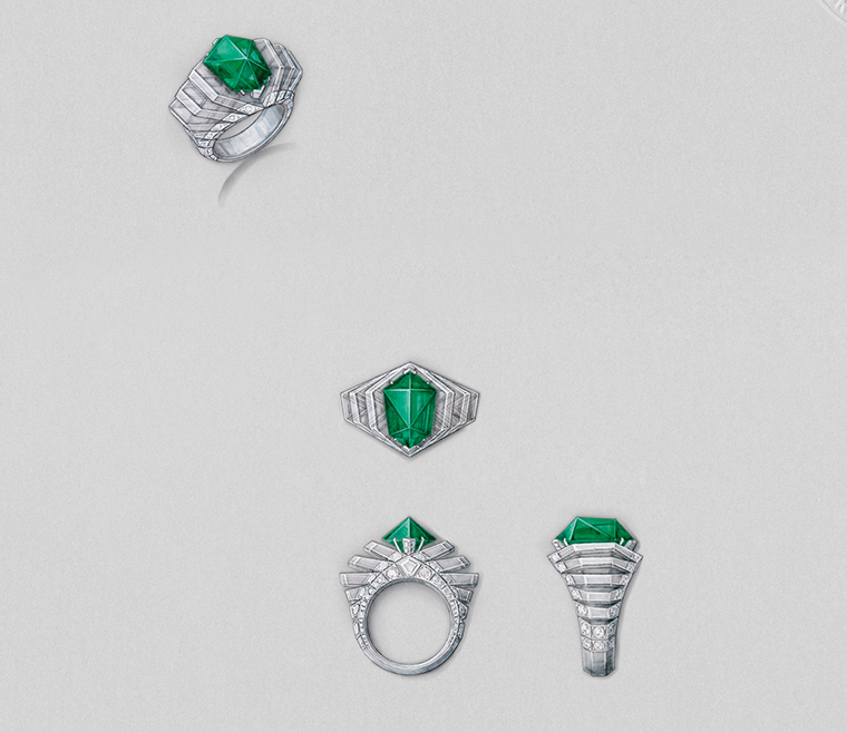 แหวนวงนี้ถือกำเนิดจากรูปทรงเรขาคณิตของมรกตแซมเบียขนาด 6.12 กะรัต ที่ถูกนำมารังสรรค์อย่างประณีตสง่างาม อัญมณีล้ำค่านี้ได้จุดประกายให้คาร์เทียร์รังสรรค์กรอบโครงสร้างหลายชั้นที่เผยให้เห็นความโดดเด่นของดีไซน์และวัสดุที่ใช้อย่างสมบูรณ์แบบ