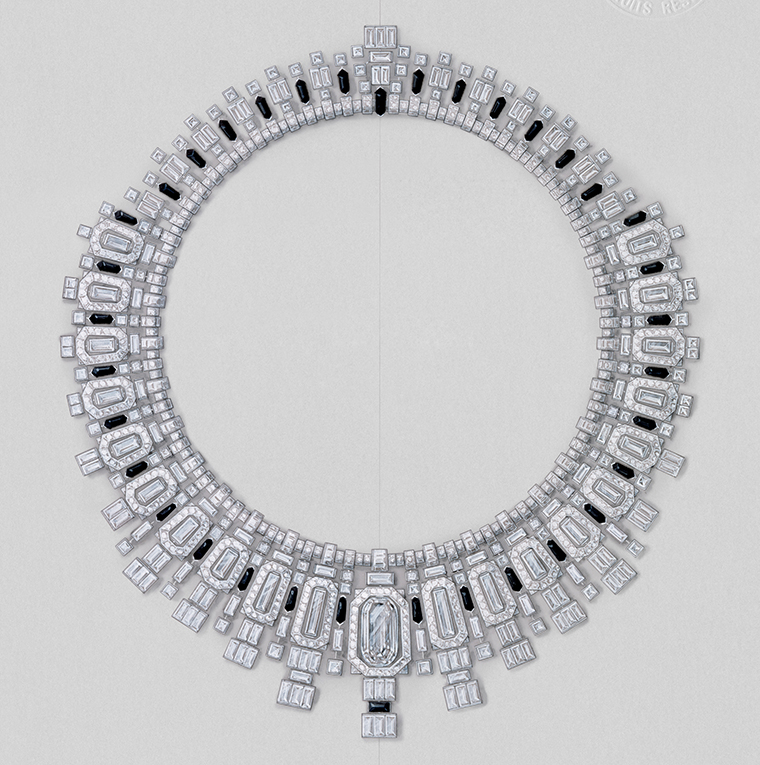 ดาวเด่นของสร้อยเส้นนี้คือเพชรเจียระไนสี่เหลี่ยมผืนผ้าขนาด 8.15 กะรัต รูปทรงเรขาคณิตรังสรรค์เป็นผลงานอันสง่างามที่ชวนให้นึกถึงเสน่ห์ของสถาปัตยกรรมแห่งยุคอาร์ตเดโค ช่างผู้ชำนาญของเมซงร้อยเรียงเพชรทรงเดียวกันอีกกว่า 20 เม็ดที่เปล่งประกายตัดสลับจังหวะกับออนิกซ์สีดำ สร้างความสมมาตรที่คมชัดและพลังของลวดลายกราฟิกอันโดดเด่น