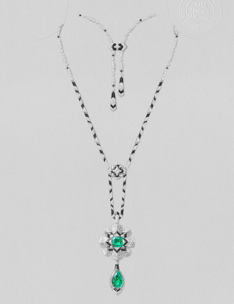 มรกตโคลอมเบียสองเม็ดน้ำหนักรวมกว่า 5.37 กะรัต มอบกลิ่นอายอาร์ตเดโคให้กับเครื่องประดับชั้นสูงที่ผสานความงดงามของพฤกษาและรูปทรงเรขาคณิต เม็ดแรกเจียระไนเป็นทรงลูกแพร์กลายเป็นจี้อันโดดเด่น ส่วนเม็ดที่สองเจียระไนเป็นทรงสี่เหลี่ยมแบบเอเมรัลด์คัทประดับอยู่ใจกลางดอกไม้ที่กำลังเบ่งบานซึ่งประดับด้วยเพชร ออนิกซ์ และร็อคคริสตัล การฝังมรกตทั้งสองเม็ดต้องอาศัยความประณีตขั้นสูงสุดเพราะรังสรรค์ด้วยเทคนิคแบบล่องหน ทำให้มรกตดูราวกับลอยอยู่กลางอากาศ กรอบจี้และสายสร้อยประดับประดาไปด้วยเพชรแวววาวตัดกันอย่างลงตัวกับออนิกซ์สีดำซึ่งทำให้เกิดลวดลายที่มีมิติมากยิ่งขึ้น เรียกได้ว่าชิ้นงานนี้โดดเด่นสะดุดตาด้วยพลังเปี่ยมอารมณ์อย่างแท้จริง