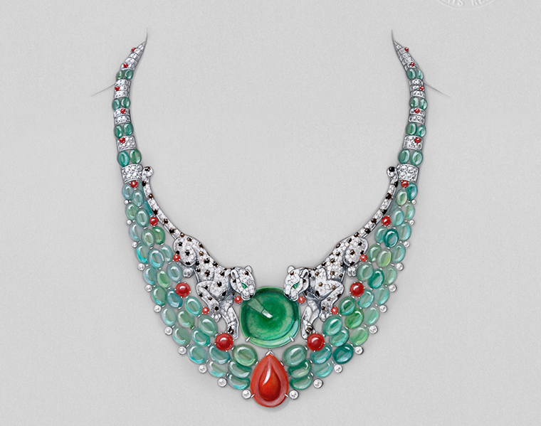 เพื่อเสริมความโดดเด่นให้กับคู่สีนี้ คาร์เทียร์เลือกใช้ดีไซน์แบบสมมาตร โดยวางเสือแพนเตอร์สองตัวที่เผชิญหน้ารอจังหวะพุ่งกระโจนเข้าหากัน สัตว์สัญลักษณ์ประจำเมซงทั้งสองโดดเด่นด้วยความสมจริง ไม่ว่าจะเป็นทรวดทรง ลายเส้น ความถูกต้องตามกายวิภาค ดวงตามรกตอันเฉียบคม ลวดลายจุดดำไปจนถึงปลายออนิกซ์ที่อุ้งเท้า คาร์เทียร์สามารถรังสรรค์ทุกรายละเอียดเพื่อมอบชีวิตให้กับเครื่องประดับสุดตระการตาเส้นนี้