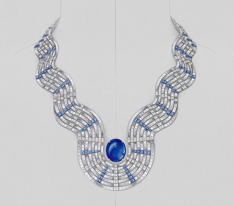 แซฟไฟร์สีน้ำเงินเข้มเม็ดเดี่ยวจากมาดากัสการ์ ขนาด 41.85 กะรัต โอบล้อมไปด้วยด้วยประกายระยิบระยับของโครงสร้างทรงเกลียวคลื่น ช่างฝีมือประสานศิลปะการฝังอัญมณีและการประกอบข้อต่ออย่างประณีตแม่นยำเพื่อให้ได้ชิ้นงานที่อ่อนช้อย ยืดหยุ่นแนบรับกับสรีระรอบฐานลำคอได้อย่างพอดี ตัวสร้อยรังสรรค์ขึ้นจากท่อนโลหะประดับเพชรขนาดเล็กที่ร้อยเรียงเป็นเส้นสายทรงโค้งตัดสลับกันกับสีน้ำเงินสดของแซฟไฟรทรงคาลิบร์ที่มาเพิ่มมิติให้กับดีไซน์ การเลือกใช้โครงสร้างแบบเปิดและการเล่นกับขนาดที่โอบรับอัญมณีเม็ดหลักของสร้อยเส้นนี้คือเครื่องพิสูจน์ถึงความเป็นเลิศของช่างฝีมือประจำเมซงอย่างแท้จริง