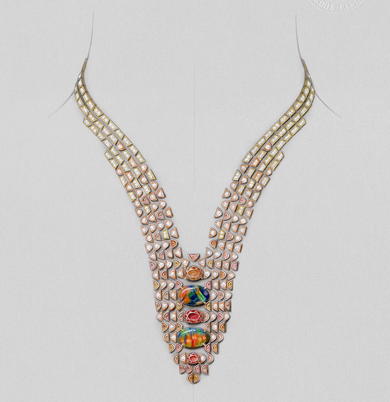 ผลงานชิ้นนี้ถือกำเนิดจากการสำรวจพลังของสีสันที่ถ่ายทอดผ่านวัสดุอันล้ำค่า ดังจะได้เห็นจากการจัดวางโอปอลคู่สุดตระการตาไว้ที่ใจกลางของสร้อยเส้นนี้ โอปอลทั้งสองเม็ดเปล่งประกายสีเหลือบรุ้งอย่างงดงามท่ามกลางกรอบของแสงสะท้อนโทนแดง ส้ม และเหลืองจากแซฟไฟร์ทั้งสามสี สายสร้อยรังสรรค์ด้วยตาข่ายที่ถักทอจากเยลโลว์โกลด์และโรสโกลด์พร้อมประดับแซฟไฟร์อุมบาเพื่อประกายสีที่ดูอบอุ่นละมุนตา ไม่ว่าจะเป็นความสมดุลระหว่างอัญมณีที่เลือกใช้ การเหลือบของเฉดสี และดีไซน์โค้งเว้ารับกับทรงของอัญมณี ทุกองค์ประกอบล้วนสอดประสานเป็นหนึ่งเดียวกัน