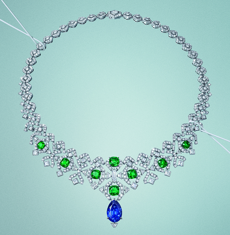 สร้อยคอเส้นนี้สะท้อนคู่สีที่เป็นเอกลักษณ์ของคาร์เทียร์มานานกว่าศตวรรษ อย่างการเลือกใช้แซฟไฟร์เซย์ลอนทรงลูกแพร์ 11.70 กะรัต คู่กับมรกตแซมเบีย 8 เม็ด รวม 9.31 กะรัต การออกแบบเผยลวดลายกราฟิกที่ขับเน้นรูปทรงสี่เหลี่ยมขอบมนของมรกต ผ่านเส้นโค้งเว้าสวนทางกันอย่างมีจังหวะ จี้แซฟไฟร์ดูโดดเด่นท่ามกลางเส้นสายสร้อยที่สลับระหว่างพื้นที่เติมเต็มและช่องว่างเพื่อสร้างสมดุลระหว่างตัวเรือนและอัญมณีซึ่งเผยให้เห็นความเชี่ยวชาญของช่างประจำเมซง ลวดลายโครงสร้างแบบเปิดมอบพลังให้กับชิ้นงาน ส่วนเพชรทรงสี่เหลี่ยมจตุรัสและทรงเหลี่ยมแบบยาวที่ประดับตามริมขอบช่วยเติมเต็มความสะดุดตาได้อย่างสมบูรณ์แบบ