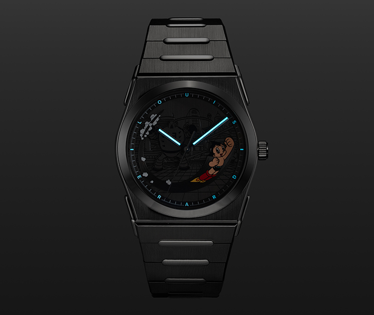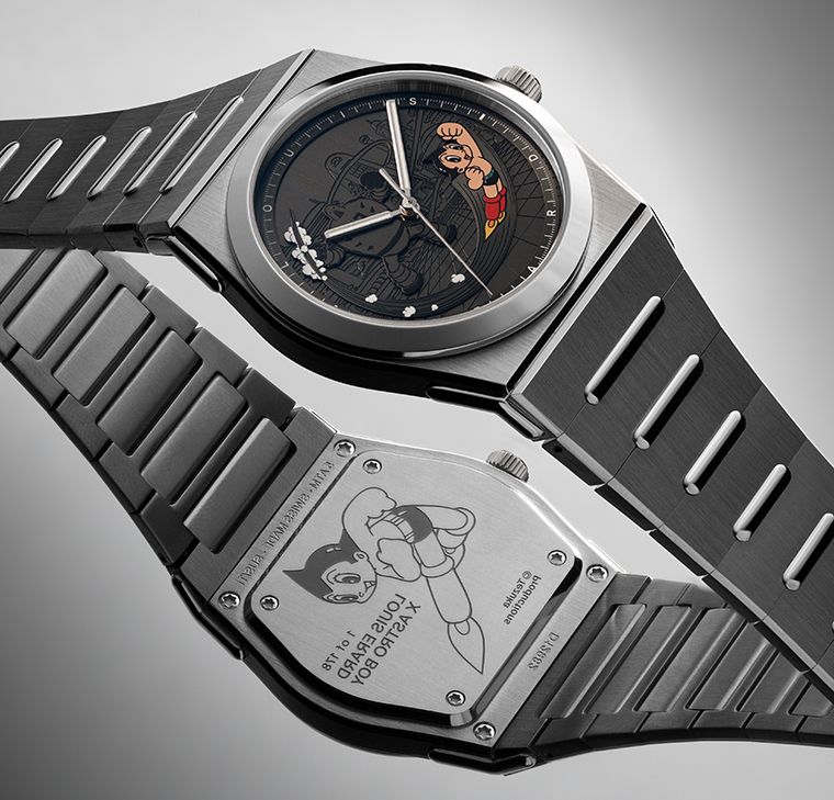 ตั้งแต่ปี 1952 จนถึงปัจจุบัน Astro Boy ผลงานสร้างสรรค์โดยเจ้าพ่อแห่งมังงะ Osamu Tezuka ได้กลายเป็นสัญลักษณ์ป๊อปคัลเจอร์ระดับโลก หุ่นยนต์ตัวน้อยนี้เกิดจากความเศร้า สร้างขึ้นเพื่อทดแทนเด็กที่สูญเสีย แต่กลับกลายเป็นนักสู้ผู้ยืนหยัดต่อสู้กับความอยุติธรรมด้วยหัวใจและความเป็นมนุษย์ เป็นความขัดแย้งที่น่าทึ่ง—หุ่นยนต์ที่มีความเป็นมนุษย์มากกว่ามนุษย์หลายคน Astro Boy จึงกลายเป็นสัญลักษณ์ของความหวัง มนุษยธรรม และการอยู่ร่วมกัน สำหรับรุ่นพิเศษนี้ Louis Erard ได้ร่วมมือกับ Tezuka Productions เพื่อขอสิทธิ์ใช้ภาพประกอบต้นฉบับจากซีรีส์คลาสสิกของ Astro Boy ผ่านการปรับแต่งอย่างประณีต Astro Boy ถูกสร้างเป็นชิ้นงานสามมิติบนหน้าปัด พร้อมลวดลายควันและก้อนเมฆด้านหลัง เพิ่มความลึกและมิติทำให้ตัวละครดูมีชีวิต ด้านหลังตัวละครคือหนึ่งในตัวร้ายชื่อดังของซีรีส์ ถูกถ่ายทอดในโทนสีดำ ส่วนฉากหลังระหว่างทั้งสองคือเมือง Metro City ที่ตกแต่งด้วยลวดลายขัดแบบซาตินแนวตั้ง และสลักลึกบนพื้นหน้าปัด ด้านฝาหลังตัวเรือนสลักอย่างประณีต เพื่อรำลึกถึง Astro Boy และอนาคตที่เขาต่อสู้เพื่อให้เป็นจริง