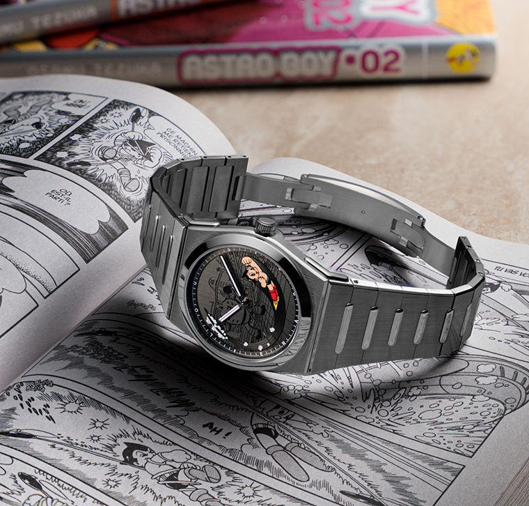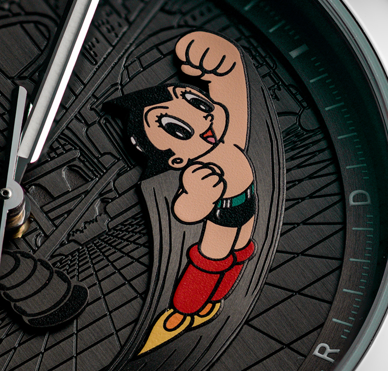 ไม่มีตัวเลขชี้เวลา ดูไม่รก มีเพียงเรื่องราว นาฬิการุ่นพิเศษนี้สร้างสรรค์หน้าปัดให้เหมือนจอภาพยนตร์ ที่ซึ่ง Astro Boy โบยบินอยู่ จากตำแหน่ง 6 ถึง 12 นาฬิกา หน้าปัดสลักเป็นฉากหลังเมือง Metro City พร้อมการขัดแบบซาตินแนวตั้ง การออกแบบสร้างมิติผ่านการสร้างเลเยอร์หลายชั้น Astro Boy ในสีสันเต็มเปี่ยม พุ่งออกมาจากหน้าปัดพร้อมร่องควันและก้อนเมฆด้านหลัง ขณะที่ตัวร้ายสีดำเงียบสงบแอบปรากฏอยู่เบื้องหลัง เส้นวงแหวนวงกลมยกตัวโอบล้อมฉากทั้งหมด พิมพ์สเกลนาทีสีขาวเคลือบสารเรืองแสงซูเปอร์ลูมิโนว่า SLN-C1 โทนสีน้ำเงิน การสร้างเลเยอร์ของหน้าปัดประกอบด้วยสามชิ้นงาน: Astro Boy, ตัวร้าย และขอบวงในของหน้าปัด รวมถึงหน้าปัดหลักสลักลึกสองระดับ เพื่อเพิ่มมิติและและความแตกต่างของผิวสัมผัส