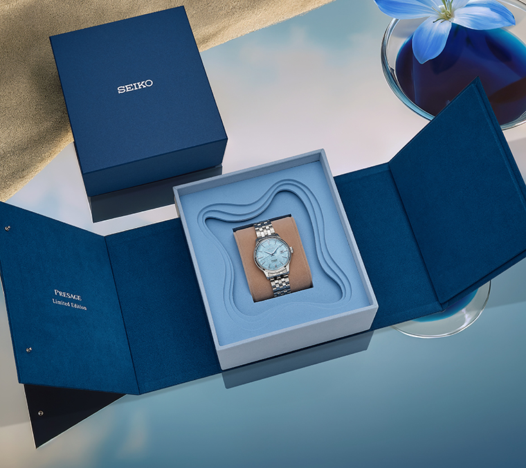 กล่องมาในรูปทรงสี่เหลี่ยมจตุรัสสีน้ำเงิน-ฟ้า ผ้ากำมะหยี่ เมื่อเปิดออกจะพบกับนาฬิกา Seiko Presage Cocktail Time ‘Maya Bay’ Limited Edition ที่ถูกโอบล้อมด้วยรูปทรง ‘คลื่น’ เหมือนกับช่วงเวลายามคลื่นน้ำ สาดกระทบชายฝั่งของอ่าวมาหยา เข้าหานาฬิกาที่ถูกวางประดับไว้บนหมอนสีน้ำตาลอ่อน ดั่งผืนทรายละเอียดนั่นเอง