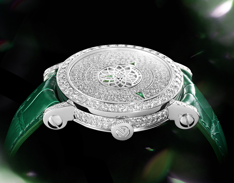 บรรจุภายในตัวเรือนโรสโกลด์หรือไวท์โกลด์ และมีขนาดเส้นผ่านศูนย์กลาง 39 มม. ที่เรือนเวลา ราวนด์ ทริเปิล มิสทรี ผสมผสานความกล้าหาญเชิงประติมากรรมเข้ากับความประณีตแห่งจักรกล ด้วยหน้าปัดประดับตกแต่งเพชรเป็นลวดลายขดกลมวนราวกับกำลังร่ายมนตร์สะกด ที่ดึงดูดสายตาสู่เครื่องหมายแสดงเวลารูปทรงสามเหลี่ยมหมุนได้ทั้งสามชิ้น แต่ละชิ้นประดับด้วยอัญมณีที่ทำหน้าที่เดินไปตามร่องรอยของเวลาบนเส้นทางของตนเอง และเปลี่ยนรูปการเดินผ่านของเวลาไปสู่การเต้นระบำราวกับวัตถุท้องฟ้า สำหรับผู้ที่กำลังมองหาสัมผัสเพิ่มเติมแห่งความเปล่งประกายแวววาวระยิบระยับเรือนเวลา ราวนด์ ทริเปิล มิสทรี ยังมาพร้อมกับความหลากหลายของตัวเลือกในเวอร์ชันขอบตัวเรือนประดับเพชรทรงบาแกตต์คัต
