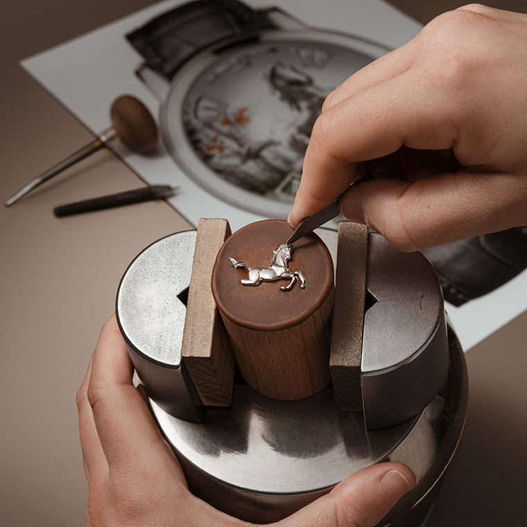 ม้าและโขดหินถูกแกะสลักขึ้นจากไวท์โกลด์หรือพิงค์โกลด์ 18K โดยช่างแกะสลักผู้เชี่ยวชาญ เพื่อสร้างรายละเอียดอันประณีต เช่น แผงคอและหางของม้า พร้อมขับเน้นพื้นผิวและเส้นสันของรูปทรงด้วยการขัดแต่งผิวด้วยมือ การเพ้นท์ขนาดจิ๋วด้วยเทคนิคการลงยาช่วยเพิ่มมิติของเฉดสีให้ลุ่มลึกยิ่งขึ้น โดยรวมแล้วการสร้างสรรค์ลวดลายนี้ ต้องอาศัยความประณีตและใช้เวลาทั้งหมดถึงสามวันเต็ม