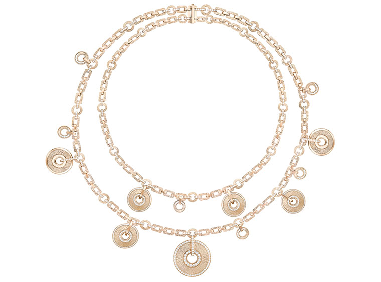 เริ่มต้นจาก สร้อยคอพร้อมจี้ขนาดเล็กที่มีให้เลือกถึง 2 เวอร์ชั่น ทั้งในตัวเรือนโรสโกลด์ หรือ ไวท์โกลด์ มาพร้อมเพชรบริลเลียนต์คัตใจกลางตัวเรือน ที่ถูกโอบล้อมด้วยดีไซน์คล้ายเครื่องหมายวงเล็บไว้อย่างมีชั้นเชิง สามารถมิกซ์แอนด์แมตช์เพิ่มเติมกับกำไลข้อมือเข้าชุดกัน ต่อด้วยจี้ขนาดกลางที่เติมลูกเล่นความสนุกสนานยิ่งขึ้นด้วยการนำเอาทองคำขัดเงา หรือ ประดับเพชร มาตัดสลับด้วยลวดลายเฉพาะตัวจากเทคนิค Palace Décor เพิ่มความมีชีวิตชีวาอีกขั้นด้วยประกายแวววาวของเพชรจากห่วงคล้อง ปิดท้ายที่จี้ขนาดใหญ่ มาพร้อมสายโซ่ทองแบบ palm-mesh ใส่เข้าคู่กับต่างหูโรสโกลด์ อีกไอเท็มที่เติมเต็มความเย้ายวนของคอลเลกชั่นนี้ให้สมบูรณ์แบบยิ่งขึ้น โดยอีกไฮไลต์ห้ามพลาดก็คือ สร้อยคอดีไซน์สะดุดตา ผลงานชิ้นเอกที่ทั้งชูความสง่างามของทองคำและยกระดับความหรูหราด้วยดีไซน์อันนำสมัยได้อย่างขบถนอกกรอบ ตัวสร้อยประกอบด้วยจี้หลากหลายดีไซน์ทั้งแบบเรียบและประดับเพชรน้ำหนักรวม 8 กะรัต ร้อยเรียงอยู่บนสายโซ่ที่มีความยาวต่างกัน 2 เส้น ที่บ่งบอกถึงความพิถีพิถันของ Piaget ในทุกมิติ