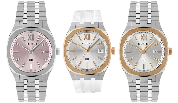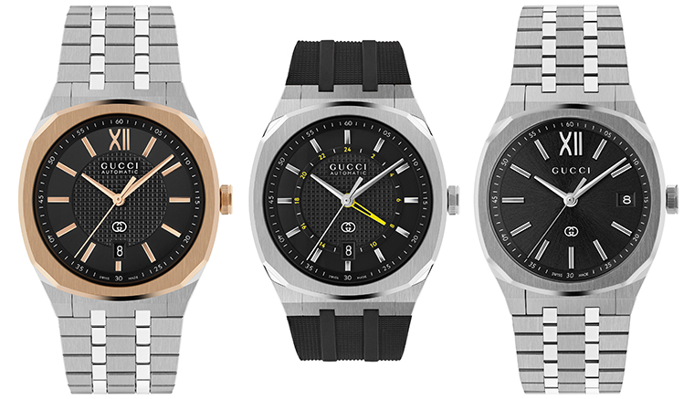 สำหรับ GUCCI 25H รุ่นใหม่ ขนาด 40 มิลลิเมตร เปิดตัวทั้งหมดสามรุ่น หนึ่งในนั้นคือ รุ่น GMT สีดำสนิท ที่มาพร้อมเข็ม GMT สีเหลืองสดตัดกับสเกล 24 ชั่วโมงกลางหน้าปัด ให้สามารถบอกเวลาได้หลายโซนอย่างง่ายดาย เสริมความโมเดิร์นด้วยสายยางสีดำแบบเปลี่ยนได้ทันที อีกสองรุ่นมาในสตีลพร้อมหน้าปัดสีดำ หนึ่งรุ่นประกอบกับขอบตัวเรือนชุบพิงก์โกลด์ อีกหนึ่งรุ่นสตีลตลอดเรือน ทั้งคู่จับคู่กับสายสตีลห้าข้อต่อเนียนตา
