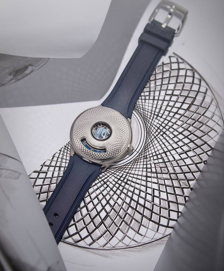 รูปลักษณ์ของ Time Jumper ได้แรงบันดาลใจจาก “จานบิน” ที่โด่งดังในยุค 1960s ซึ่งตรงกับวัยเด็กของ Xavier ที่หลงใหลในภาพยนตร์ไซไฟพอ ๆ กับเครื่องจักรกล การออกแบบโดย Thomas Funder ถ่ายทอดเส้นโค้งและมุมอย่างละเอียด ลบเหลี่ยมทุกจุดจนเกิดความลื่นไหลแบบอากาศพลศาสตร์ ปุ่มเปิดฝาโค้งมน เม็ดมะยมถูกซ่อนไว้แนบตัวเรือนราวกับเป็นส่วนหนึ่งของมัน แม้แต่หัวเข็มขัดสายหนังยังถูกออกแบบให้โค้งรับกับข้อมือโดยปราศจากเหลี่ยมมุม
