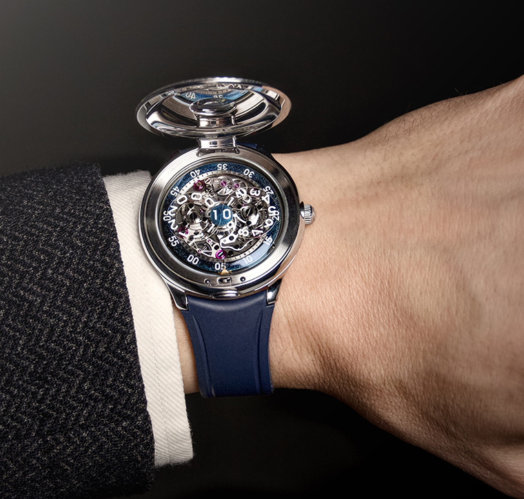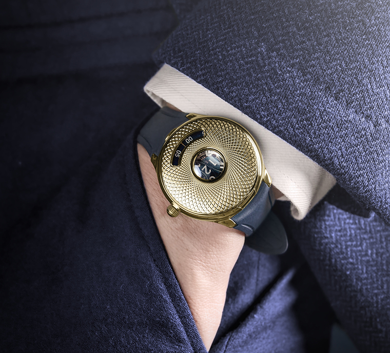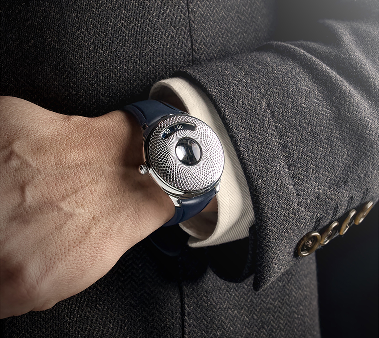 ใต้ฝาครอบแบบ half-hunter สัญลักษณ์ที่เชื่อมโยงกับนาฬิกาพกในศตวรรษที่ 19 แฝงไว้ด้วยระบบบอกเวลาที่แหวกขนบอย่างสิ้นเชิง กลไก “ชั่วโมงแบบกระโดด” (jumping hour) โดยแสดงเวลาแบบ 24 ชั่วโมง ผ่านจานใสสองชั้นทำจากแซฟไฟร์หนึ่งสำหรับเลขหลักหน่วยและอีกหนึ่งสำหรับหลักสิบ ขณะที่นาทีเคลื่อนผ่านวงแหวนรอบนอกอย่างต่อเนื่อง แนวคิดนี้ไม่เพียงเป็นการบอกเวลา หากเป็นบทสนทนาระหว่างอดีตกับอนาคต การตีความศิลป์แห่ง “เวลา” ใหม่ทั้งหมด ผ่านมุมมองของศตวรรษที่ 21