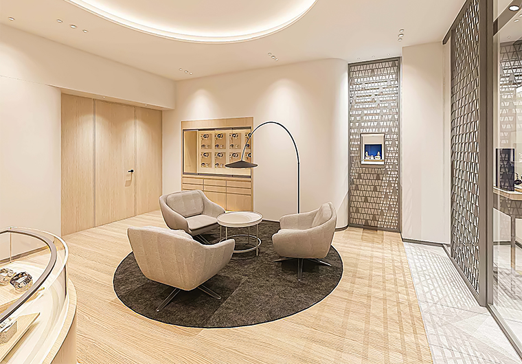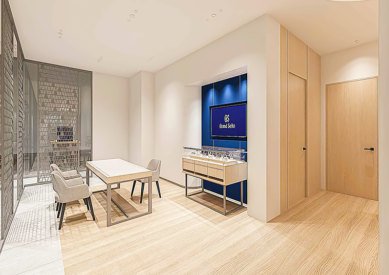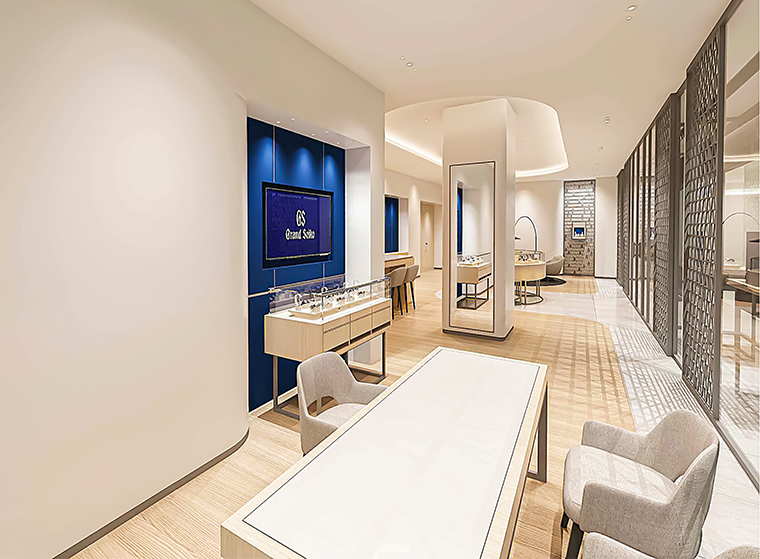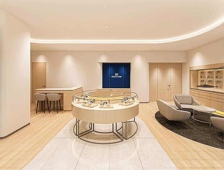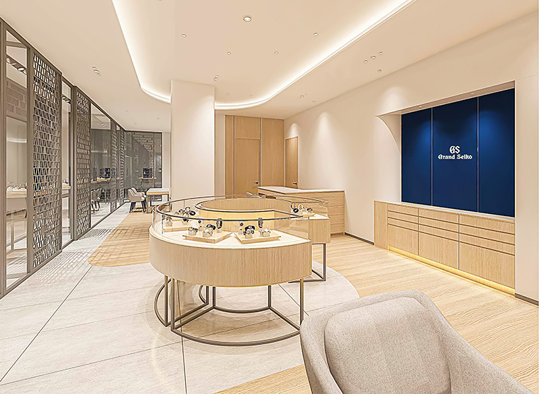 การตกแต่งภายในของบูติกแห่งใหม่นี้ผสมผสานความงามร่วมสมัยเข้ากับแรงบันดาลใจจากงานฝีมือญี่ปุ่นแบบดั้งเดิมอย่างกลมกลืน ไม่ว่าจะเป็นการเลือกใช้โทนสีเรียบหรู การจัดแสงให้ดูสบายตา และพื้นผิวไม้สีอ่อน ที่ช่วยสร้างบรรยากาศที่สงบและน่ารื่นรมย์ ฉากกั้นโปร่งแสงถูกติดตั้งเพื่อจัดแยกพื้นที่สำหรับชมนาฬิกาและพื้นที่จัดแสดงบริเวณด้านหน้าอย่างเป็นสัดส่วน เพื่อให้ผู้ที่มาเยือนได้รับชมนาฬิกาในบรรยากาศที่เป็นส่วนตัว ดีไซน์ของฉากกั้นเหล่านี้ได้แรงบันดาลใจจาก Kumiko เทคนิคงานไม้อันเก่าแก่ของญี่ปุ่นที่ช่างฝีมือจะใช้แผ่นไม้ประกอบขึ้นเป็นลวดลายตารางอย่างประณีตโดยไม่ใช้ตะปู สะท้อนจิตวิญญาณของแบรนด์ที่เคารพในศิลปะชั้นสูงที่ต้องอาศัยทักษะความเชี่ยวชาญของช่างศิลป์ โลโก้ของแบรนด์บนผนังสีน้ำเงินอันเป็นเอกลักษณ์ ช่วยเติมเต็มบรรยากาศ พื้นที่ส่วนจัดแสดงทรงกลมที่กึ่งกลางของพื้นที่ร้าน รายล้อมด้วยมุมที่จัดสรรให้เป็นพื้นที่ต้อนรับ และเชื้อเชิญให้ผู้มาเยือนได้รับชมเรือนเวลา คอลเลกชันต่างๆ ได้ตามอัธยาศัย