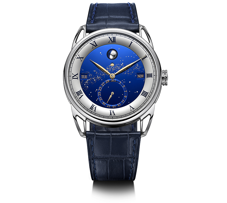 ปฏิทินถาวรถูกจัดวางบนพื้นหน้าปัดที่ประดับท้องฟ้าเต็มไปด้วยดวงดาวและภาพทางช้างเผือก โดยใช้สถาปัตยกรรมหลายชั้น ประกอบด้วยชิ้นส่วนรูปวงแหวนล้อมรอบหน้าปัดย่อย และสเกลบอกนาทีสีเงิน หน้าปัดย่อยแสดงวันที่ในตำแหน่ง 6 นาฬิกา ส่วนช่องแสดงวันและเดือนอยู่ที่ตำแหน่ง 9 นาฬิกา และ 3 นาฬิกา บอกเวลาอย่างแม่นยำผ่านเข็มเยลโล่โกลด์ที่ผ่านการขัดแต่งด้วยมือจนได้ผิวเงาราวกระจก