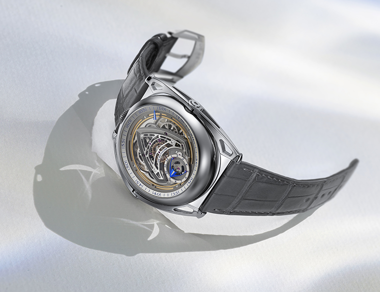 ด้านหลังที่ได้รับแรงบันดาลใจจากความคลาสสิก มาพร้อมหน้าปัดทรงโค้งสีแอนทราไซต์ กลางหน้าปัดตกแต่งลวดลายกิโยเช่ การอ่านเวลาจึงเรียบง่ายและงดงาม เข็มทอง 5N โค้งขัดเงาด้วยมือเข้าคู่กับหลักชั่วโมงเคลือบทอง ส่วนมาตรวินาทีทำจากไทเทเนียมขัดเงา ช่วยแสดงการกระโดดของวินาทีชัดเจน