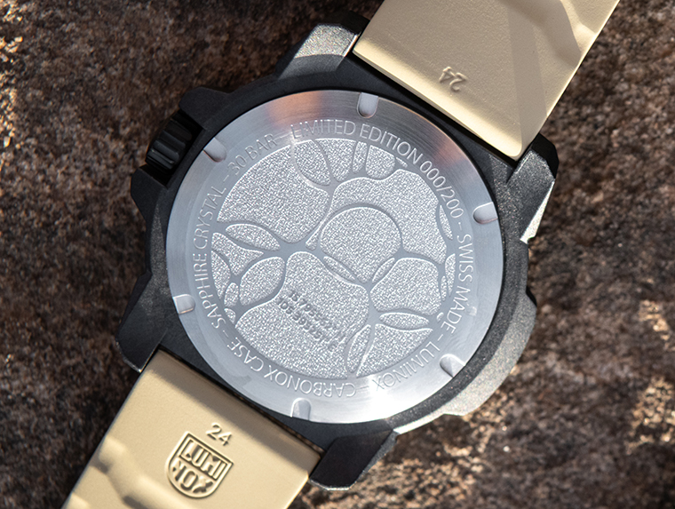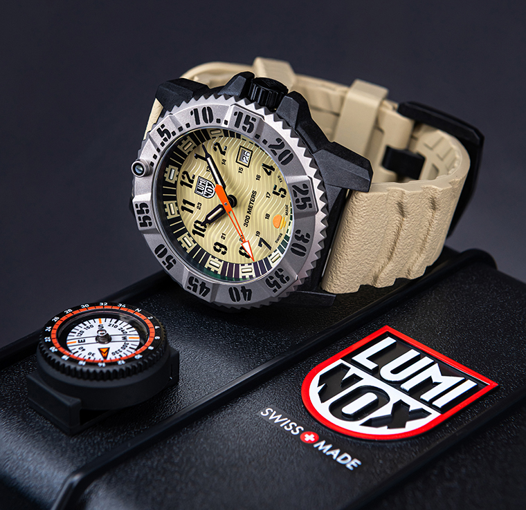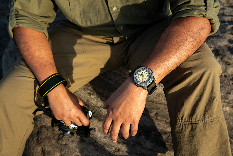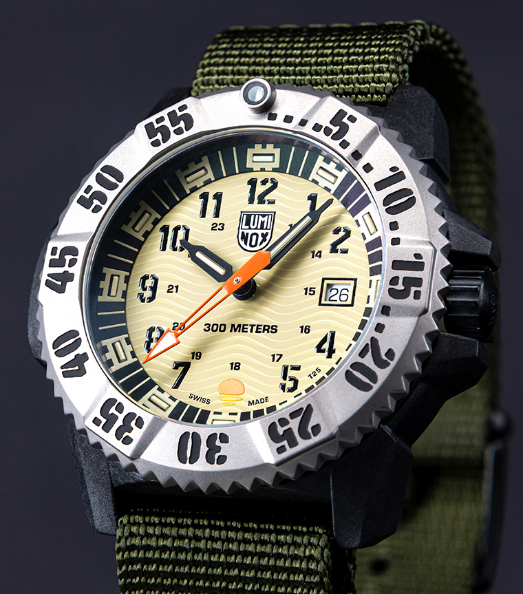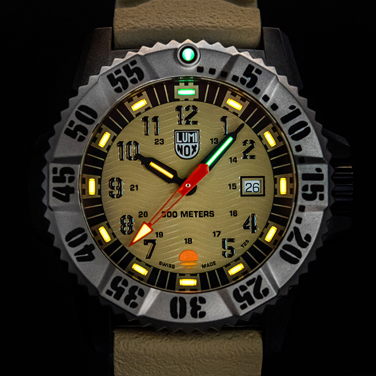 ดีไซน์ยังใส่ใจรายละเอียดเล็กน้อยที่สื่อถึงธรรมชาติอย่างทรงพลัง เช่น สัญลักษณ์พระอาทิตย์ที่ตำแหน่ง 6 นาฬิกา ซึ่งแทนช่วงเวลาที่ดวงตะวันโผล่พ้นขอบฟ้า ทอแสงกระทบผิวน้ำและโขดหินจนเกิดเป็นทิวทัศน์สุดตระการตา ความงดงามนี้ยังถูกย้ำด้วยแสงเรืองรองจากเทคโนโลยี SuperLumi-Nova® สีส้มที่บริเวณสัญลักษณ์พระอาทิตย์และเข็มวินาที ผสานกับ Luminox Light Technology (LLT) บริเวณหลักชั่วโมง 1–12 ที่สามารถเรืองแสงได้ยาวนานถึง 25 ปี