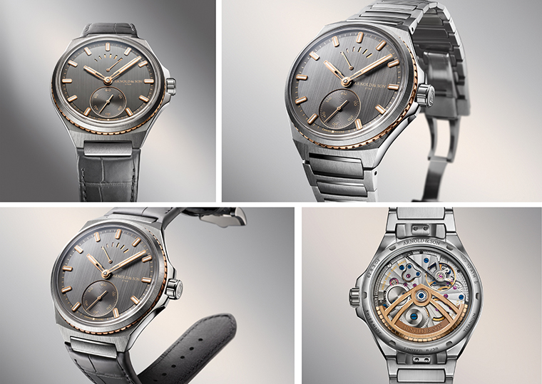 บริเวณละติจูดที่ 49 องศาเหนือ ผืนน้ำกว้างใหญ่ของมหาสมุทรแอตแลนติกตอนเหนือมักเปลี่ยนเป็นสีเทาเมทัลลิกเมื่อพายุประจำฤดูใบไม้ร่วงเริ่มตั้งเค้า สำหรับนาฬิการุ่น Longitude 5°W ลิมิเต็ดอิดิชันจำนวน 38 เรือนนี้ Arnold & Son ได้เลือกใช้เฉดสีดังกล่าวบนหน้าปัดเพื่อถ่ายทอดภาพของทะเลที่บรรจบกับท้องฟ้าครึ้มด้วยเมฆฝนอันหม่นมัว หน้าปัดขัดแต่งด้วยลายขัดแนวตั้ง ให้สัมผัสคล้ายคลื่นที่โหมกระหน่ำผ่านผิวน้ำในมหาสมุทรอันปั่นป่วน และราวกับหมู่เกาะที่โผล่พ้นม่านหมอก เพื่อเน้นภาพและสื่อถึงอารมณ์แห่งการเดินเรืออย่างแจ่มชัด ชวนให้นึกถึงหมู่เกาะ Isles of Scilly ที่อยู่ใกล้ Lizard Point มาตรแสดงระดับพลังงานสำรองถูกจัดวางไว้ที่ตำแหน่ง 12 นาฬิกา ส่วนด้านตรงข้ามคือหน้าปัดย่อยที่เข็มวินาทีเคลื่อนที่อย่างแม่นยำ องค์ประกอบทั้งหมดถูกออกแบบและจัดวางอย่างเรียบง่ายและกลมกลืน โดยมีเข็มชั่วโมงและนาทีแบบฉลุโปร่ง (skeletonised) พร้อมเคลือบสารเรืองแสงเช่นเดียวกับหลักชั่วโมง เพื่อให้สามารถมองเห็นได้ชัดเจนแม้ในความมืด