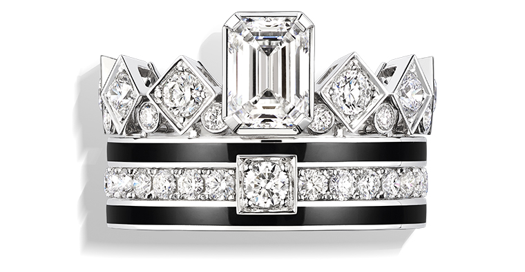 ตัวแหวนมีรูปทรงคล้ายมงกุฎ พร้อมเสริมความงดงามด้วยขอบสีดำที่ขับให้ดีไซน์ดูสง่างาม ผสานความโดดเด่นเข้ากับความหรูหราแบบร่วมสมัยได้อย่างลงตัว