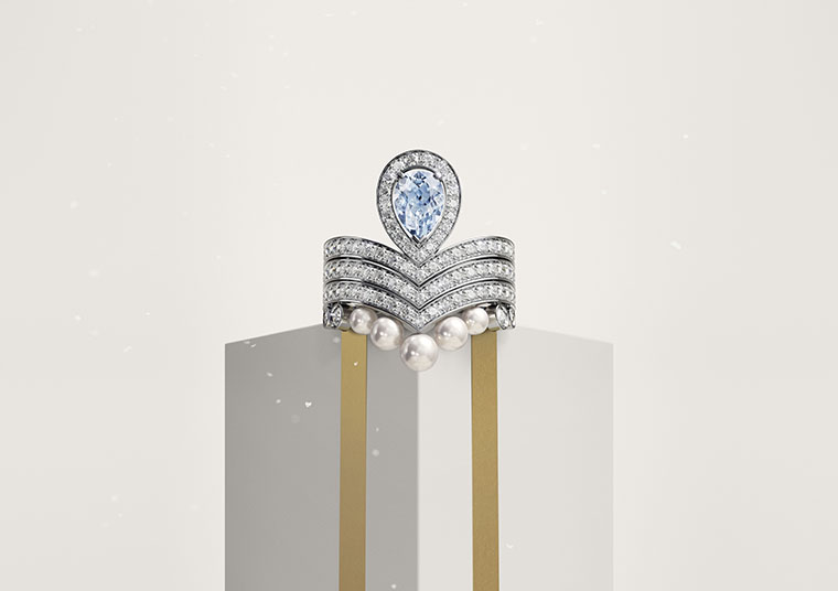 ด้วยความสามารถในการสวมใส่ได้หลากหลาย แหวน Joséphine Aigrette ที่สามารถสวมแบบซ้อนกันได้สะท้อนสไตล์อันเป็นเอกลักษณ์ของคอลเลกชันได้เป็นอย่างดีไข่มุกที่ร้อยเรียงต่อเนื่องตามแนวแหวนและอความารีนทีเปล่งประกายดังน้ำแข็ง ถูกขับเน้นให้โดดเด่นด้วยเพชรสีขาวบริสุทธิ์