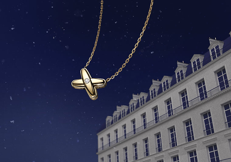 จี้ Jeux de Liens Harmony โดดเด่นด้วยดีไซน์ลายเส้นไขว้และขอบประดับเพชร Pavéที่ระยิบระยับ แผ่ประกายราวแสงอาทิตย์บนผิวทองคำที่ขึ้นลวดลายอย่างประณีต โอบรับลำคอด้วยความงดงามเปล่งประกายอย่างสง่างามเหนือระดับ