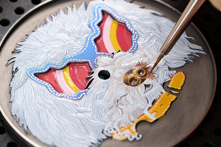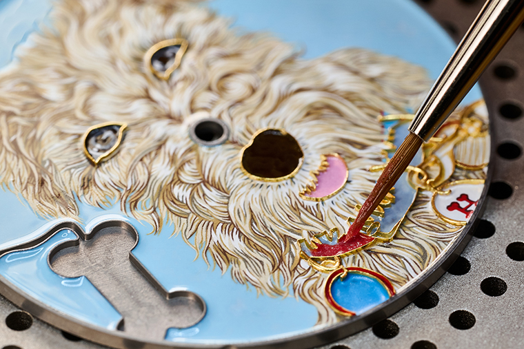 ส่วน เอมี พร้อมด้วยแว่นตาตกแต่งลายของเธอได้ถูกสร้างรูปขึ้นภายในห้องปฏิบัติการของช่างแกะสลัก โดยกำเนิดขึ้นจากความชำนาญและความอุตสาหะของศิลปิน ที่งานออกแบบนี้มีชีวิตขึ้นจากปลายพู่กันอันละเอียดอ่อนเพื่อถ่ายทอดไว้ด้วยเฉดสีสันสดใสได้อย่างมีชีวิตชีวา รวมถึงผ่านกระบวนการเผาไฟอย่างต่อเนื่อง ที่ช่วยเสริมความโดดเด่นของโทนสีและรายละเอียดที่แตกต่างกันแม้เพียงเล็กน้อย เพื่อถ่ายทอดเป็นภาพของเจ้าสุนัขแสนซนตัวนี้ ถัดมาคือ ทาโค พร้อมแววตาเปื้อนรอยยิ้มที่รังสรรค์ขึ้นจากงานวาดภาพย่อส่วน และงานลงยาแบบคลัวซอนเน (cloisonné) โดยช่างศิลปินจะเริ่มต้นด้วยการระบายชั้นบาง ๆ ของสีลงยาโทนฟ้าลงบนหน้าปัด จากนั้นจึงวาดระบายด้วยมือบนขนสีขาวราวกับเสื้อโค้ทของเจ้าสุนัขเหนือพื้นหลังลายขด เทคนิคงานลงยาแบบคลัวซอนเนนี้ถูกใช้เพื่อย้ำถึงมิติแบบนูนต่ำของลายขนและความมีมิติลุ่มลึกของปลอกคอ โดยการใช้เส้นลวดทองที่มีความหนาแตกต่างกันมาวางเป็นโครงขอบให้กับพื้นที่ที่สำรองไว้สำหรับการตกแต่งด้วยงานลงยา ก่อนที่จะหลอมละลายเส้นลวดทองนี้เข้ากับงานลงยาในระหว่างกระบวนการเผา เทคนิคนี้ช่วยให้สามารถมอบมิติของการตกแต่งอันประณีตและรุ่มรวยไปด้วยสีสัน