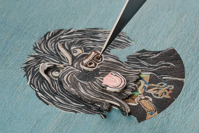 เริ่มต้นจากเจ้าสุนัข ออร์สัน ในโทนสีดำและขาวที่รังสรรค์ขึ้นจากงานต่อลายไม้ ราวกับการต่อภาพจิ๊กซอว์ ที่แต่ละรายละเอียดของเจ้าสุนัขตัวนี้ได้ถูกบรรจงตัดอย่างพิถีพิถันละเอียดอ่อน ก่อนจะนำมาประกอบและติดกาวกลายเป็นภาพอันสมบูรณ์แบบ ขณะที่ตะกร้อครอบปาก ดวงตา จมูก และลิ้น ผ่านการวาดภาพระบายสี เพื่อสร้างสรรค์แสงและมิติของภาพบนชิ้นไม้สำหรับต่อลายที่ได้มาจากไม้แปดชนิดแตกต่างกัน เพื่อรังสรรค์หน้าปัดที่ดูราวกับมีชีวิต