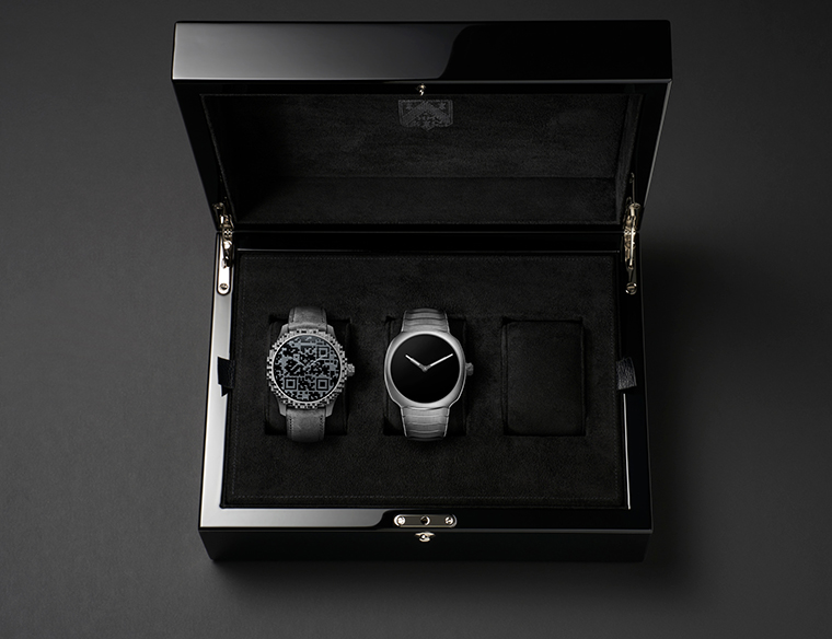 เหนือผิวหน้าปัดคือวัสดุสีดำที่มืดที่สุดในโลก Vantablack® พื้นที่ว่างสีดำสนิทที่กลืนแสงกว่า 99.965% ทำให้เข็มที่ประดับด้วย Globolight® วัสดุเซรามิกเรืองแสงแบบ 3 มิติ ลอยขึ้นมาราวกับไม่มีสิ่งใดรองรับอยู่ด้านล่าง วัสดุสีดำมืดของหน้าปัดเช่นนี้ไม่ได้ทำหน้าที่เป็นเพียงพื้นหลัง แต่เป็น “ช่องว่าง” ที่ทำให้เวลาเด่นชัดขึ้นด้วยการขีดเส้นวิถีของเข็มบนความมืดที่ไร้ก้นบึ้ง ขณะเดียวกัน เม็ดมะยมพิมพ์สามมิติที่ยังคงดีไซน์พิกเซลจากรุ่นแรกถูกถอดบทบาทจากสัญลักษณ์แห่งโลกดิจิทัล ให้กลายเป็นเครื่องเตือนใจว่าแม้แนวคิดจะเกิดในโลกเสมือน แต่ผลลัพธ์สุดท้ายยังคงถูกหล่อขึ้นด้วยโลหะที่จับต้องได้