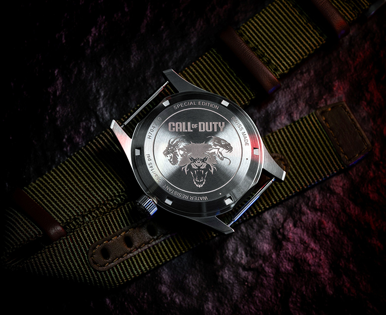 นาฬิกาสวิสสุดทนทานรุ่นนี้ได้รับการออกแบบให้เข้ากับโทนสีของโลก “Black Ops” อย่างสมบูรณ์แบบ มาพร้อมตัวเรือนสแตนเลส หน้าปัดสีดำ และนาฬิกาเคลือบสาร เรืองแสง Super-Luminova® ที่ให้การมองเห็นชัดเจนแม้ในสภาวะแสงน้อย สาย NATO สีเขียวกากีเพิ่มความแข็งแกร่งในเชิงยุทธวิธี ขณะที่กลไกไขลานอัตโนมัติ H-10 มอบพลังงานสำรองยาวนานถึง 80 ชั่วโมง พร้อมรองรับทุกภารกิจไม่ว่าจะในเกมหรือในชีวิตจริง