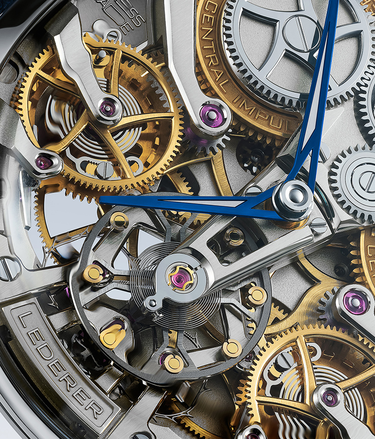 เมื่อพลิกตัวเรือน ผู้สวมใส่จะได้พบงานแกะสลักเชิงสถาปัตยกรรมที่ได้แรงบันดาลใจจากโครงสร้างของกลไก เข็มวินาทีบนหน้าปัดย่อยเคลื่อนตัวไปตาม จังหวะของ remontoir อย่างสอดประสาน เป็นสัญญาณแผ่วเบาที่บอกถึงจังหวะ ที่มีชีวิตของกลไก รายละเอียดที่ซ่อนอยู่นี้สะท้อนแนวทางของ Lederer อย่าง ชัดเจน นั่นคือ การนําเสนอความซับซ้อนทางเทคนิคด้วยความละเมียดละไมเป็นเสมือนรางวัลแก่ผู้ที่ใส่ใจมองอย่างใกล้ชิด