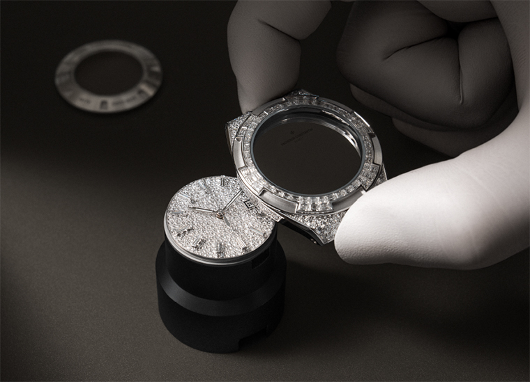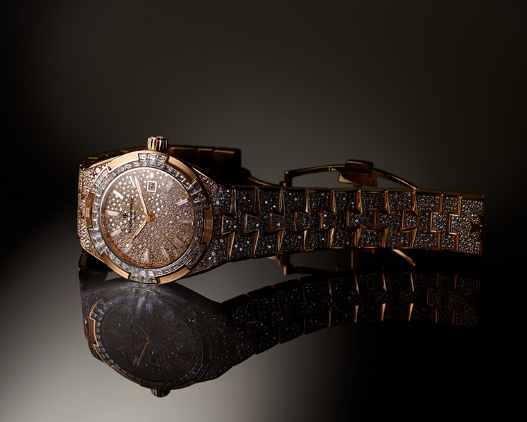 Overseas Self-Winding 35 mm High Jewellery ประดับเพชรรวมทั้งสิ้น 1,430 เม็ด น้ำหนักรวมราว 12.58 กะรัต ผสานสองรูปแบบการเจียระไนอย่างชาญฉลาด ความนิ่งสงบ สง่างามของเพชรเจียระไนทรงบาแก็ตต์ตัดกับประกายระยิบระยับหลายมิติของเพชรทรงเหลี่ยมเกสรได้อย่างมีชั้นเชิง