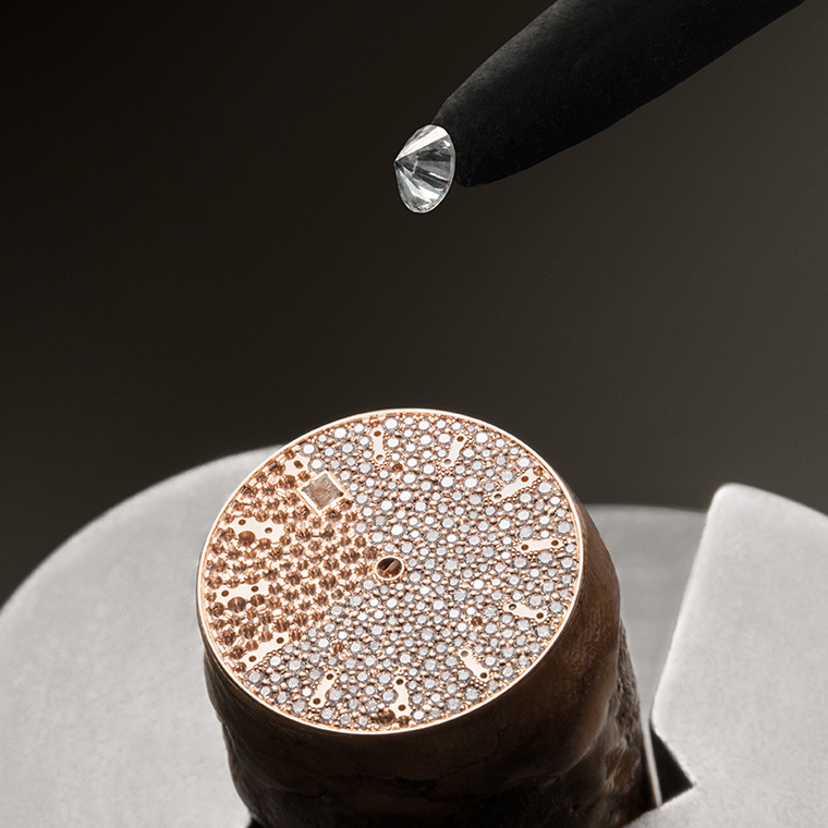 ผลลัพธ์คือพื้นผิวที่ดูราวกับเพชรลอยอยู่เหนือทองคำอย่างไร้น้ำหนัก ตัดกับประกายระยับของเพชรทรงเหลี่ยมเกสรบนหน้าปัดและสายทำด้วยโกลด์ 18K ได้อย่างงดงาม