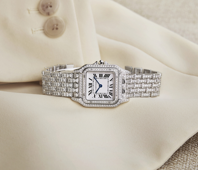 เรือนเวลาปองแตร์ เดอ คาร์เทียร์ (Panthère de Cartier) เผยออร่าในเวอร์ชันประดับเพชรทั้งเรือน ส่วนสายประดับเพชรกว่า 370 เม็ดประกอบกับเพชรอีก 106 เม็ดบนตัวเรือน สร้างประกายแสงระยิบระยับที่เคลื่อนไหวราวกับมีชีวิตอยู่บนข้อมือ ทั้งหมดลงตัวอย่างสมดุลด้วยหน้าปัดมินิมัลอันเป็นเอกลักษณ์ของปองแตร์ เดอ คาร์เทียร์ไว้ ทั้งพื้นหน้าปัดสีเงิน รางบอกนาที เข็มทรงดาบสีน้ำเงิน รวมถึงซิกเนเจอร์ลับประจำรุ่น ส่วนเม็ดมะยมยังประดับด้วยเพชรเจียระไนแบบบริลเลียนท์คัต เพื่อเติมเต็มความแววาวขั้นกว่าได้อย่างงดงาม