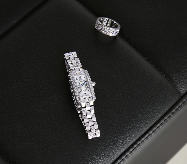 แทงก์ อเมริกัน (Tank Américaine) รุ่นมินิ การประดับเพชรกว่า 569 เม็ด ได้เปลี่ยนเรือนเวลานี้ให้กลายเป็นเครื่องประดับสำหรับยามราตรีอย่างแท้จริง หน้าปัดมาพร้อมผิวสัมผัสซาตินสีเงินที่โอบรับกับแนวข้อมือไว้โดยยังคงรายละเอียดสำคัญของนาฬิกาแทงก์ไว้อย่างครบถ้วน ทั้งดีไซน์โครงตัวเรือนอันเฉียบคม กรอบรางบอกนาทีมุมโค้ง เข็มทรงดาบสีน้ำเงิน และเม็ดมะยมประดับเพชรเจียระไนแบบบริลเลียนท์คัต (brilliant-cut)