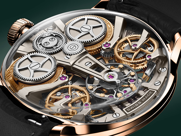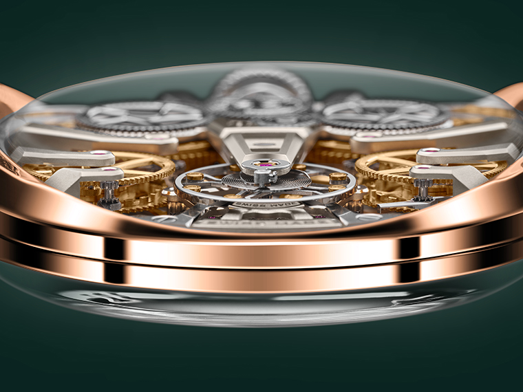 ตัวเรือนขนาด 39 มม. ทําจากทองคําโรสโกลด์ 5N ขอบหน้าปัดและขอบด้านข้างของตัว เรือนที่ขัดเงา ช่วยเพิ่มประกายความอบอุ่นให้กับสีเขียวอย่างละเมียดละไม ขณะที่ คริสตัลแซฟไฟร์ทรงโดมเปิดมุมมองดี่ม าสู่กลไกเชิงประติมากรรมภายใน หน้าต่างที่ ตําแหน่ง 10 นาฬิกาเผยให้เห็นจังหวะการเคลื่อนไหวอันเงียบสงบของกลไก Constant force เป็นเครื่องย้ําเตือนว่าทุกชิ้นส่วนที่ผ่านการเลือกสรรให้มีความงดงามเชิงสุนทรียะ ใน CIC มีไว้เพื่อตอบโจทย์การใช้งานจริงในกลไกเสมอ