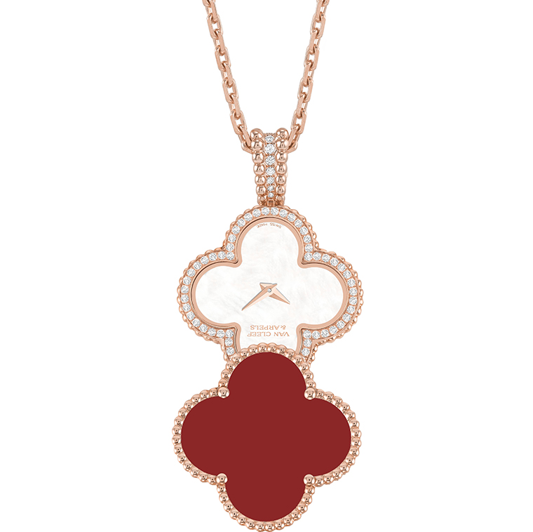 สร้อยคอซ่อนเวลา Alhambra secret ทองคำสีกุหลาบ 18 กะรัต, สลับโมราสีเพลิง, เพชร, Mother-of-pearl กลไกขับเคลื่อนระบบควอตซ์