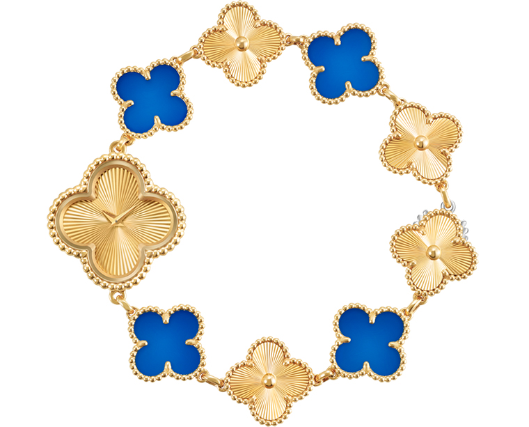 นาฬิกาข้อมือ Sweet Alhambra ตัวเรือนทองคำสีเหลืองรองรับงานประดับทองคำสีเหลืองสลักลายริ้วรัศมีตะวัน และโมราสีฟ้าสด กลไกขับเคลื่อนระบบควอร์ตซ์สวิส