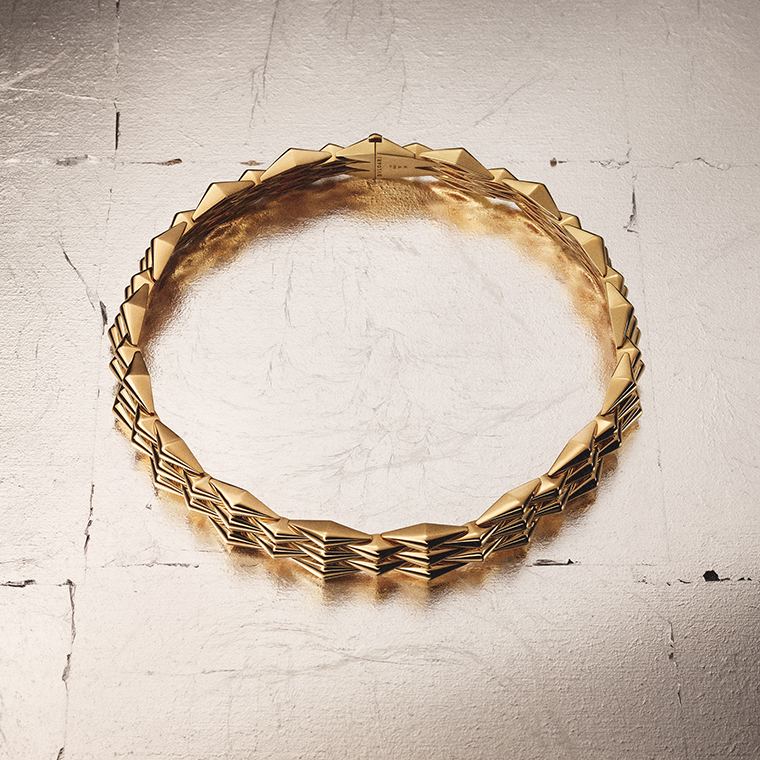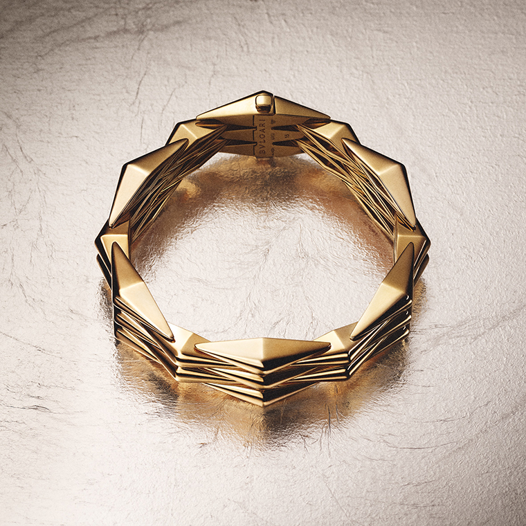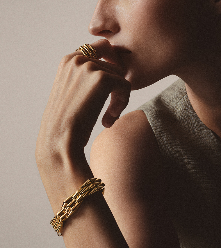 สร้อยข้อมือซึ่งเป็นหัวใจสำคัญของคอลเลคชั่นนี้ ได้รับแรงบันดาลใจโดยตรงจากเครื่องประดับในอาร์ไคฟ์ และถูกยกระดับงานฝีมือขึ้นไปอีกขั้นอย่างน่าทึ่ง ลายคลื่นสีทองโอบรับกับข้อมือด้วยชิ้นส่วนรูปทรงสี่เหลี่ยมขนมเปียกปูนที่วางแนบสนิทไปกับผิว ซึ่งยึดติดกันด้วยข้อต่อยืดหยุ่นและมองไม่เห็น เป็นความโดดเด่นร่วมสมัยที่ผสานกับเสน่ห์เหนือกาลเวลา และได้นิยามสไตล์ขึ้นใหม่ อันเป็นแก่นของบุลการีอย่างแท้จริง
