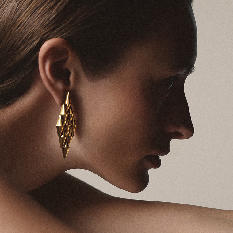 ต่างหูถูกดีไซน์ในลักษณะแนวตั้ง โครงสร้างข้อต่อที่ห้อยลงมาถูกออกแบบพิเศษ สะท้อนถึงแสงที่เปล่งประกายราวกับแสงแดดอันอบอุ่นซึ่งมาจากเยลโลวโกลด์อันเป็นเอกลักษณ์ของเมซงช่วยเพิ่มความหรูหราแบบอิตาเลียน ส่วนต่างหูแบบหนีบ สะท้อนถึงจิตวิญญาณอันกล้าหาญของโครงสร้าง วิมินี เป็นเครื่องประดับอันเปี่ยมด้วยเสน่ห์เหนือกาลเวลาที่ต้องมีไว้ครอบครอง