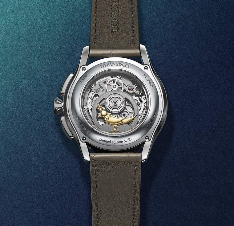 ด้านหลัง ฝาหลังแซฟไฟร์เผยรายละเอียดที่เปี่ยมด้วยเสน่ห์และอารมณ์สนุกสนานอันเป็นเอกลักษณ์ของ Tiffany & Co. นั่นคือสัญลักษณ์นกจากเข็มกลัดไอคอนิก Bird on a Rock ที่ถูกนำมารังสรรค์ใหม่ให้เกาะอยู่บนโรเตอร์ไขลานแบบโปร่ง ลวดลายนกขนาดกว้างเพียง 1.4 เซนติเมตร แกะสลักด้วยมือจากทองคำเยลโลว์โกลด์ 18k ชิ้นเดียว ยึดตามต้นฉบับของ Jean Schlumberger ในทุกรายละเอียด ก่อนผ่านการขัดเงาด้วยมือแบบดั้งเดิม เพื่อขับเน้นมิติและเส้นสาย ก่อนจะประดับลงบนโรเตอร์ ฝาหลังสลักข้อความ “Limited edition of 60”