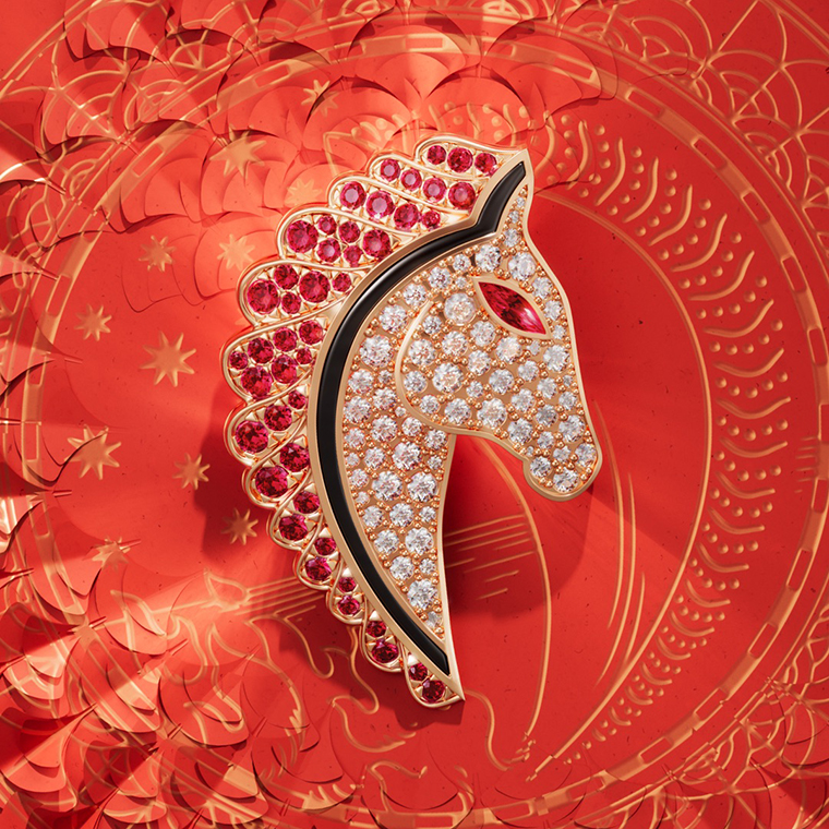 ผลงาน เข็มกลัดม้า รุ่นพิเศษ รังสรรค์ขึ้นเพื่อเป็นเกียรติกับสัญลักษณ์ประจำปีนำเสนอในเยลโลว์โกลด์ ซึ่งได้รับแรงบัลดาลใจจากดีไซน์ดั้งเดิมในช่วงทศวรรษ 1970 ผลงานนี้ถูกรังสรรค์ให้มีชีวิตขึ้นโดยใช้เวลากว่า 130 ชั่วโมงในการออกแบบ และ 50 ชั่วโมงสำหรับงานช่างทอง เป็นเครื่องพิสูจน์ถึงศิลปะอันหาที่เปรียบไม่ได้ของเมซง ชิ้นงานนี้ประดับด้วยทับทิมเจียระไนทรงคาโบชอง (cabochon rubies) กว่า 40 เม็ด รวมทั้งประดับเพชรแบบพาเว่ และออนิกส์สีดำ เปรียบดั่งเครื่องรางสมัยใหม่ที่สื่อถึงจิตวิญญาณอันกล้าหาญของม้า อวยพรให้มีความแข็งแกร่ง ความสำเร็จ และการเริ่มต้นที่ดี