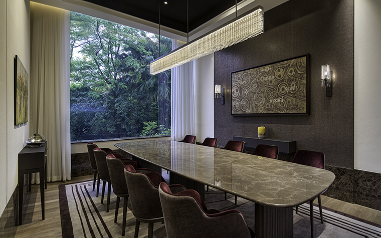 ต่อเนื่องไปยังห้องรับรองตรงข้ามที่โดดเด่นด้วยประติมากรรมช้างไม้แกะสลักอย่างประณีตโดยศิลปินชาวฝรั่งเศส สัญลักษณ์แห่งพละกำลังและความสง่างามที่หลอมรวมมรดกทางธรรมชาติ ขนบธรรมเนียม และศิลปะชั้นสูงเข้าไว้ด้วยกัน
