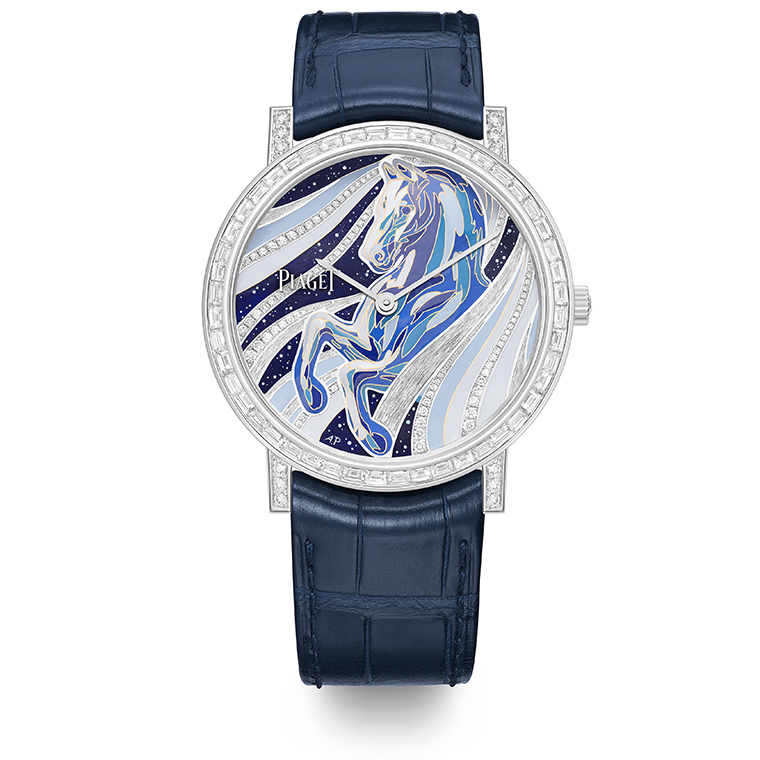 โดยหัวใจหลักของเรือนเวลาชิ้นนี้อยู่ที่รายละเอียดบนพื้นหน้าปัด ซึ่งทุกขั้นตอนต้องอาศัยหัตถศิลป์อันเชี่ยวชาญและความประณีตอย่างยิ่ง ตั้งแต่ชิ้นส่วนทองคำขาวที่ช่างฝีมือนำมาแกะสลักในเวิร์กช็อปของ Piaget จนเผยให้เห็นเค้าโครงฉากหลังที่ดูพลิ้วไหวรับกับอิริยาบทของม้าขณะกำลังกระโจนทะยาน ก่อนแบ่งเป็นช่องอย่างแม่นยำ ด้วยการนำริบบิ้นทองมาร้อยเรียงเป็นลวดลายตามแบบร่างที่สเก็ตช์ไว้ ผ่านเทคนิคเก่าแก่อย่าง คลัวซอนเน่ (Cloisonné) เพื่อเตรียมพร้อมสำหรับการลงยาเฉดสีต่าง ๆ ในขั้นถัดไป ขณะที่หัตถศิลป์อันเป็นมรดกตั้งแต่ยุค 1960s อย่าง Palace Décor ถูกนำมาถ่ายทอดลงบนชิ้นงานเช่นกัน ส่งมอบลวดลายของฉากหลังให้มีมิติสมจริงยิ่งขึ้น เสริมด้วยการฝังเพชรบริลเลียนต์คัตที่เรียงรายเป็นริ้วโค้งไปตามลายเส้น ก่อนปิดท้ายด้วยเทคนิคการลงยาแบบกรองด์เฟอ (Grand feu) ที่ครั้งนี้เมซงเลือกใช้โทนสีน้ำเงิน สีเทา และสีขาว มาถ่ายทอดเรื่องราว สะท้อนสัญลักษณ์รูปสัตว์ประจำปีอย่าง 'ม้า' ในท่วงท่าที่งามสง่าและทรงพลัง ทั้งยังเล่นแสงเงาเพื่อส่งมอบรายละเอียดของกล้ามเนื้อ ขนและแผงคอ ให้สมจริงราวกับมีชีวิตอยู่บนหน้าปัด