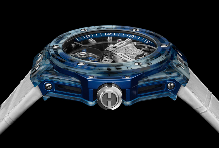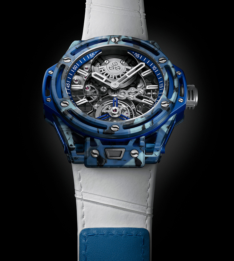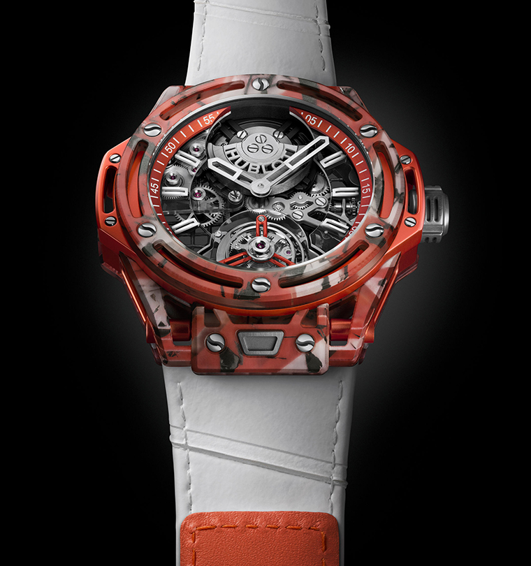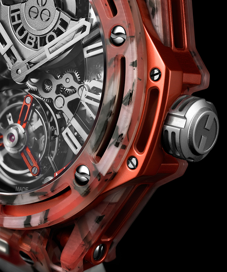 รายละเอียดความประณีตยังเห็นได้ในหลายองค์ประกอบ เช่น กรงทูร์บิญองอะลูมิเนียมของกลไกที่ผ่านการอโนไดซ์ให้เป็นสีน้ำเงิน สีส้ม หรือสีเขียว ให้เข้ากับสีของตัวเรือน ที่ตำแหน่ง 12 นาฬิกา ไมโครโรเตอร์ เรด โกลด์ 22 กะรัต ชุบโรเดียม ถูกขึ้นรูปและแกะสลักด้วยเลเซอร์เป็นโลโก้ Hublot อย่างสวยงาม ซึ่งกลไกทั้งชุดประกอบด้วยชิ้นส่วนรวมทั้งหมด 293 ชิ้น