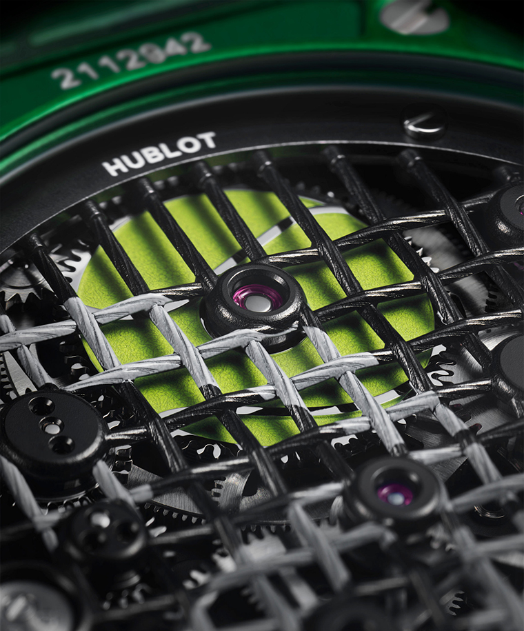 แต่ความพิเศษของนาฬิกายังไม่จบเพียงเท่านี้ บาร์เรลที่บรรจุเมนสปริงของกลไก ซึ่งให้พลังงานสำรองได้นานถึง 72 ชั่วโมง ถูกตกแต่งด้วยเฟืองเหล็กที่ออกแบบให้มีลักษณะเหมือนลูกเทนนิส สามารถมองเห็นได้จากด้านล่างผ่านโครงเมนเพลตแบบตาข่าย เพื่อสร้างเอฟเฟกต์นี้วิศวกรของ Hublot ได้พัฒนากระบวนการใหม่ เริ่มจากการนำโรเดียมขัดเงามาวางบนเส้นโค้งรูปตัว S สองเส้นที่อยู่บนพื้นผิวของเฟือง จากนั้นแกะสลักด้วยเลเซอร์อย่างประณีตให้เกิดพื้นผิวคล้ายลูกเทนนิส และปิดท้ายด้วยการเคลือบแลกเกอร์สีเขียวอมเหลือง เพื่อให้ได้รูปลักษณ์ของลูกเทนนิสที่สมจริง